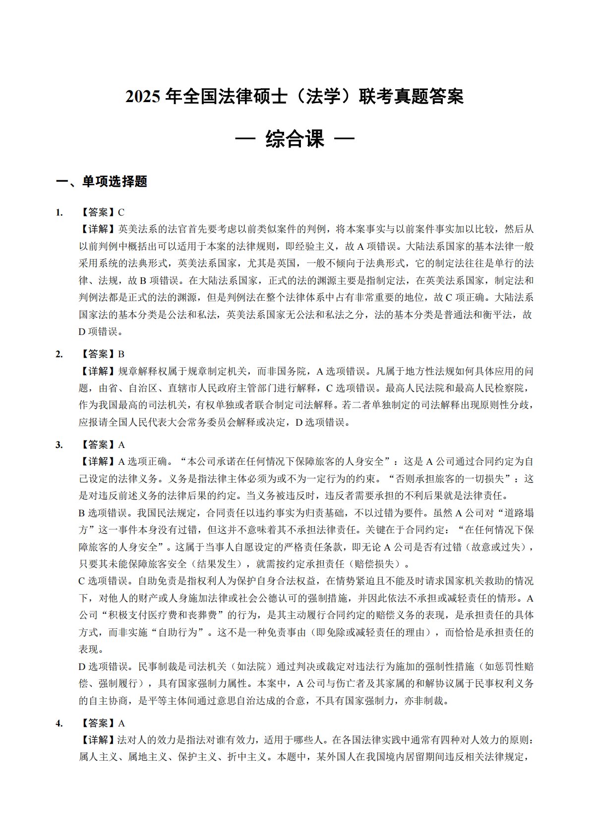 2025年全国法律硕士(法学)联考真题答案—综合课—一、单项选择题1.【答案】C【详解】英美法系的法官首先要考虑以前类似案件的判例,将本案事实与以前案件事实加以比较,然后从以前判例中概括出可以适用于本案的法律规则,即经验主义,故A项错误。大陆法系国家的基本法律一般采用系统的法典形式,英美法系国家,尤其是英国,一般不倾向于法典形式,它的制定法往往是单行的法律、法规,故B项错误。在大陆法系国家,正式的法的渊源主要是指制定法,在英美法系国家,制定法和判例法都是正式的法的渊源,但是判例法在整个法律体系中占有非常重要的地位,故C项正确。大陆法系国家法的基本分类是公法和私法,英美法系国家无公法和私法之分,...