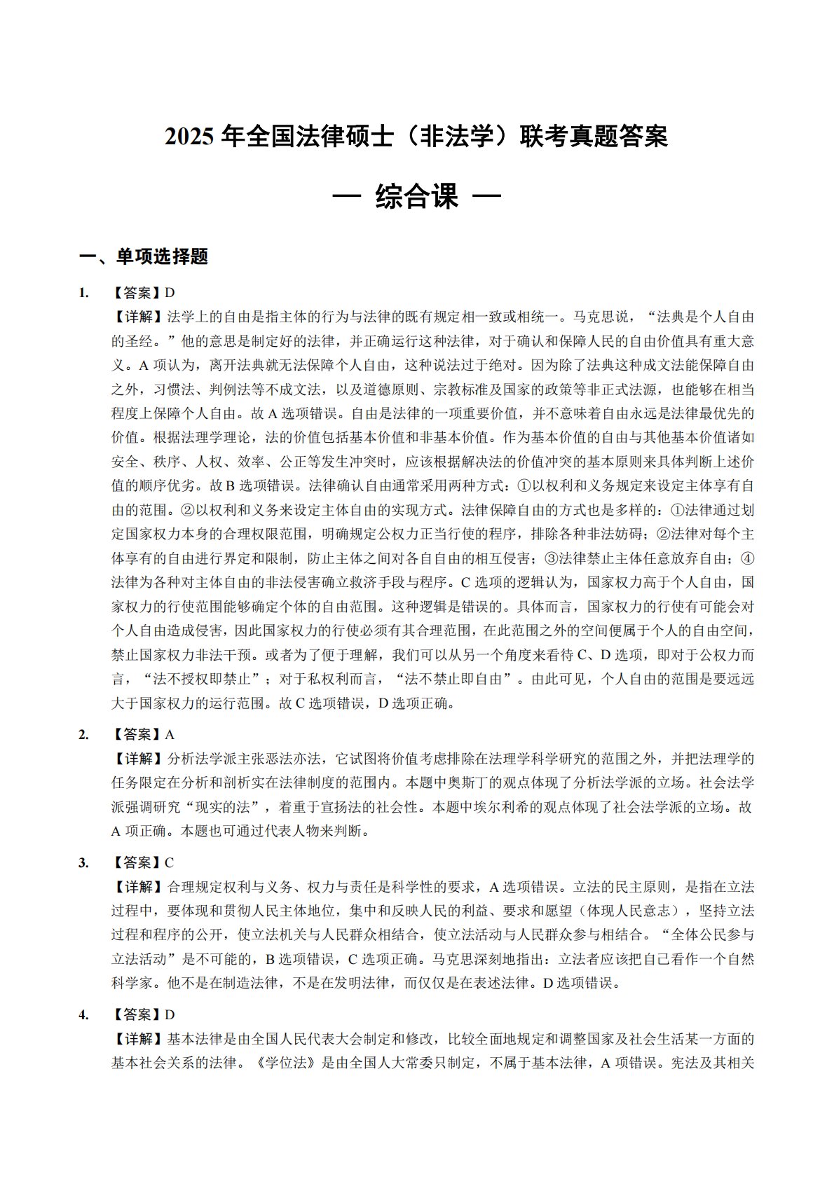 2025年全国法律硕士(非法学)联考真题答案—综合课—一、单项选择题1.【答案】D【详解】法学上的自由是指主体的行为与法律的既有规定相一致或相统一。马克思说,“法典是个人自由的圣经。”他的意思是制定好的法律,并正确运行这种法律,对于确认和保障人民的自由价值具有重大意义。A项认为,离开法典就无法保障个人自由,这种说法过于绝对。因为除了法典这种成文法能保障自由之外,习惯法、判例法等不成文法,以及道德原则、宗教标准及国家的政策等非正式法源,也能够在相当程度上保障个人自由。故A选项错误。自由是法律的一项重要价值,并不意味着自由永远是法律最优先的价值。根据法理学理论,法的价值包括基本价值和非基本价值。作...