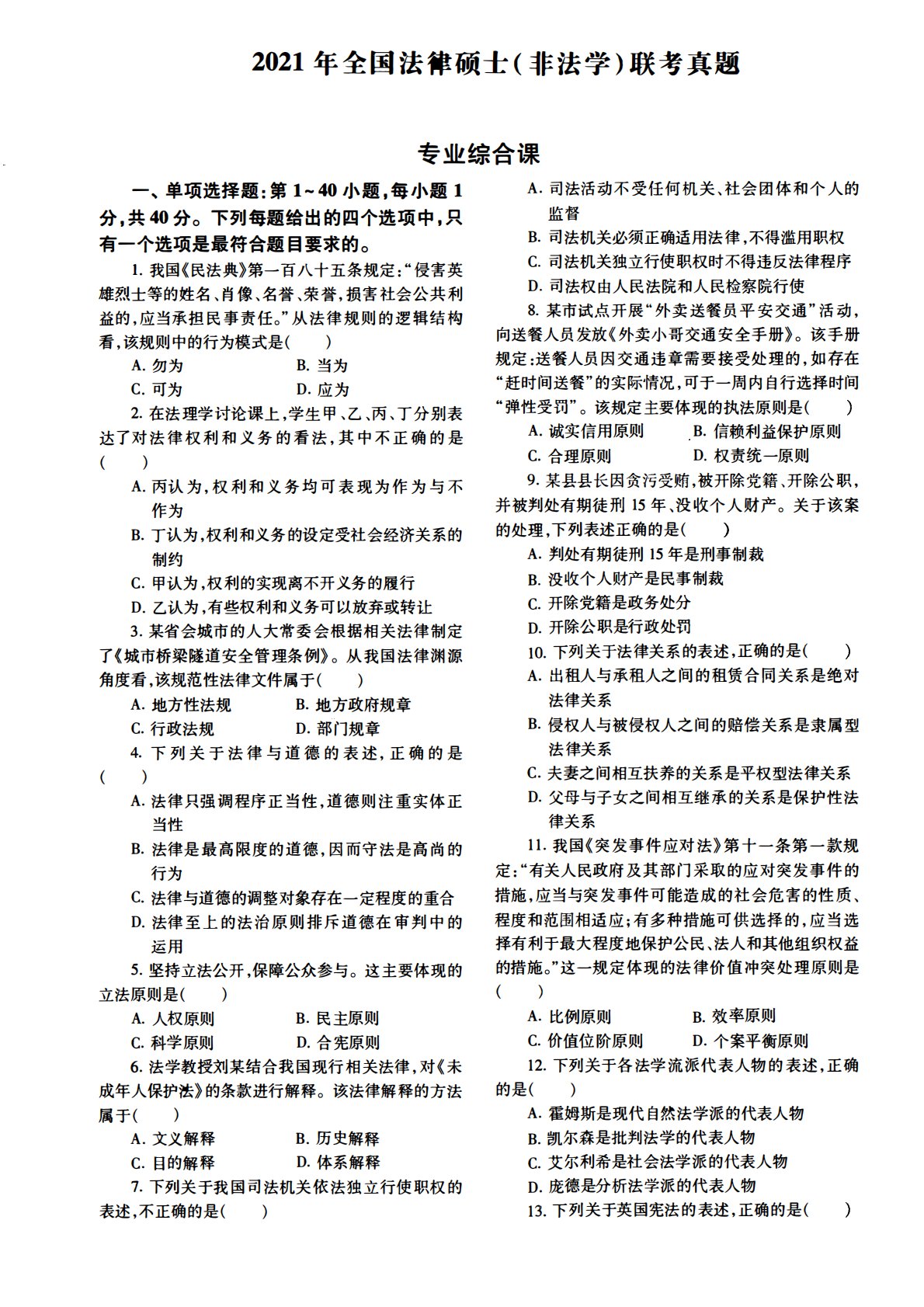 498法律硕士综合(非法学)2021年考研初试真题