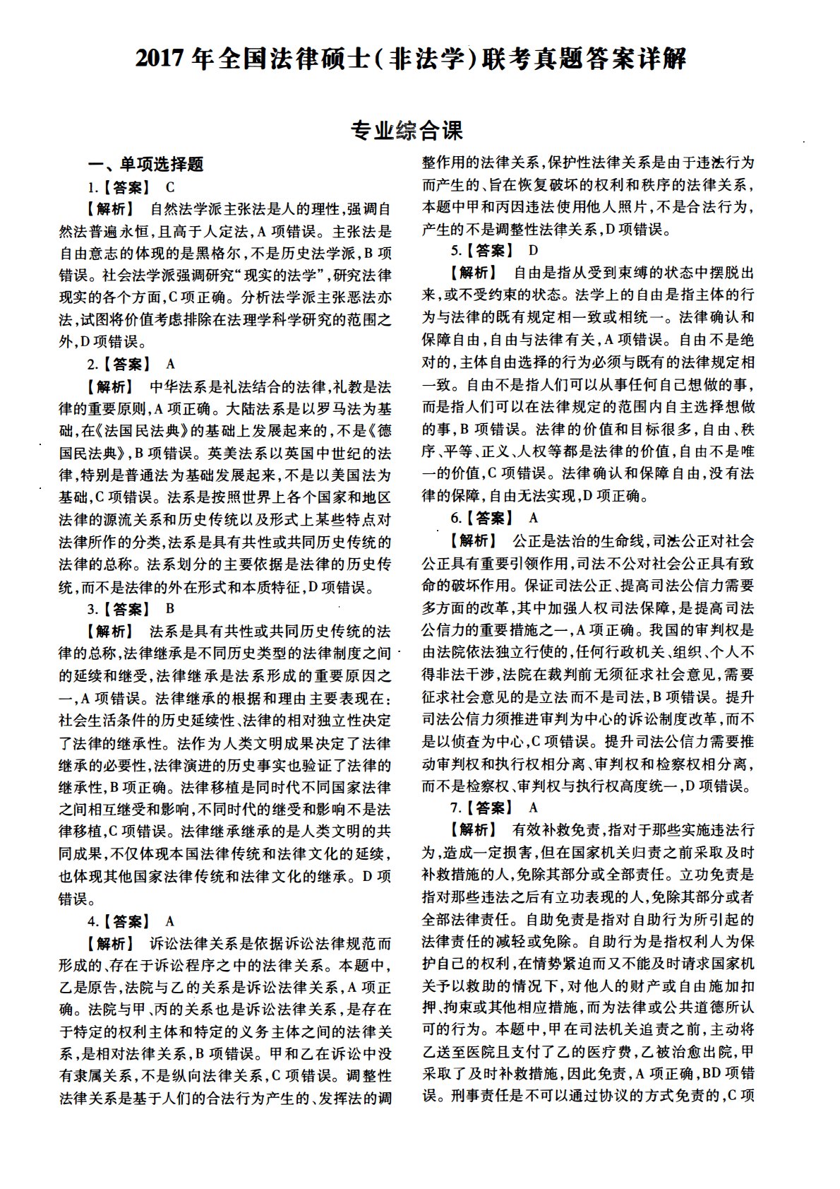 498法律硕士综合(非法学)2017年考研初试真题答案