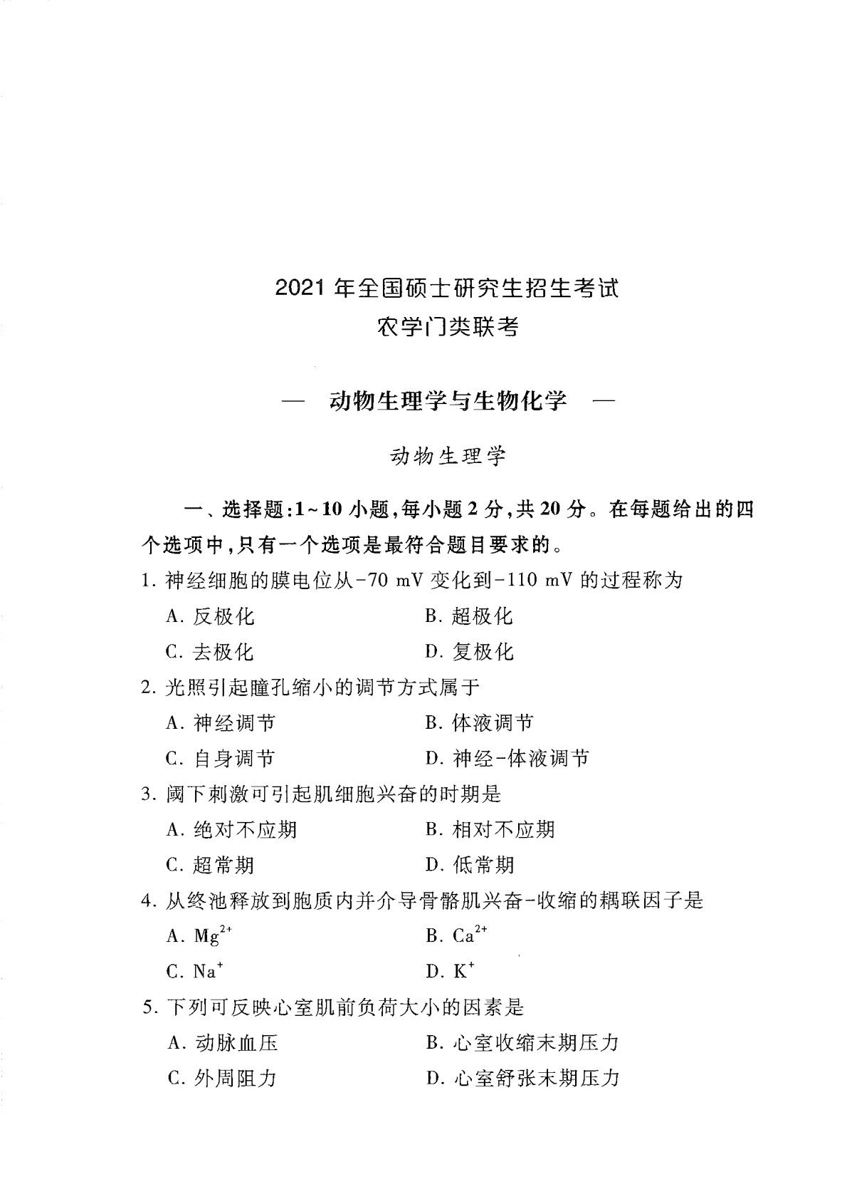 415动物生理与生物化学2021年考研初试真题
