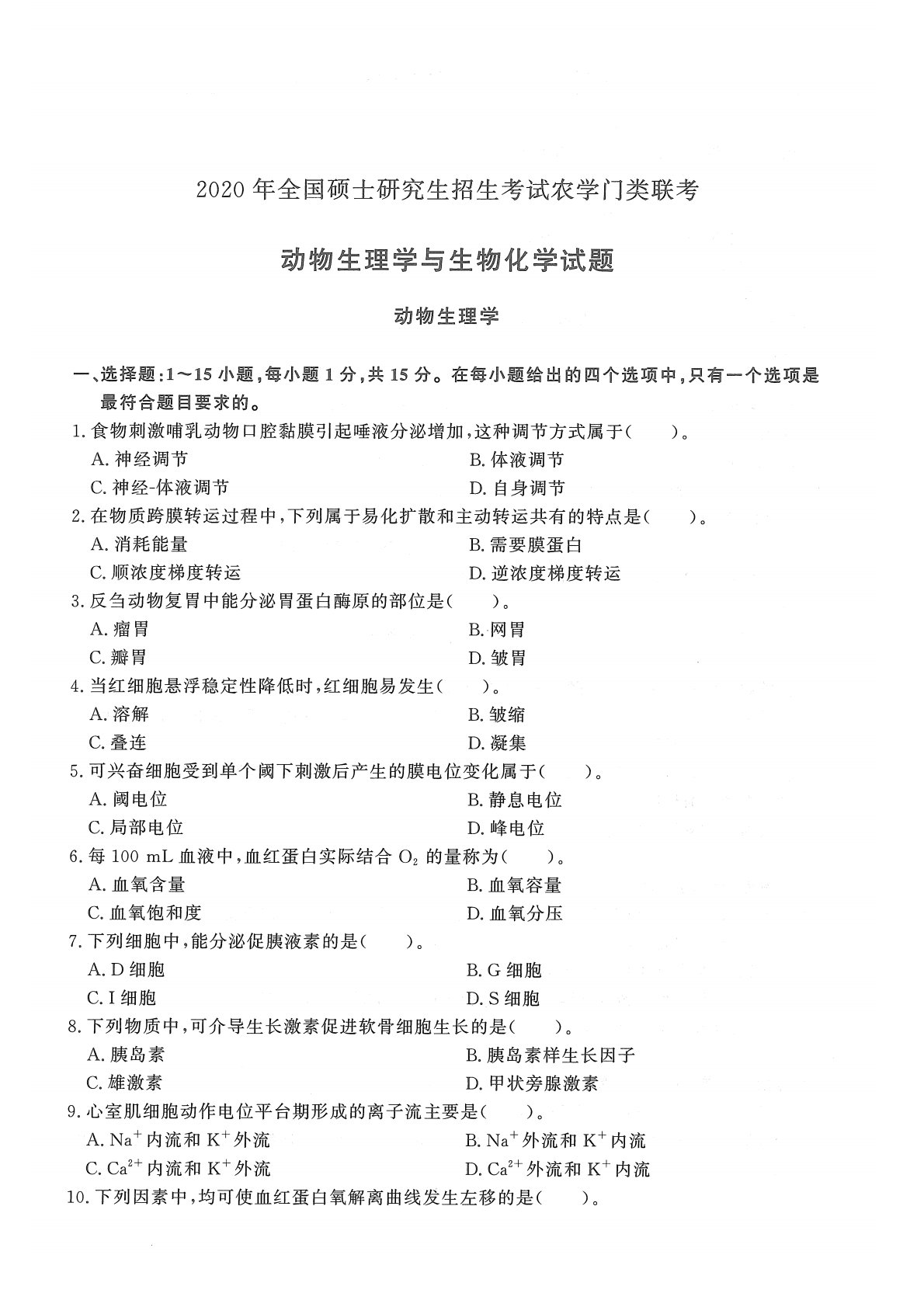 415动物生理与生物化学2020年考研初试真题