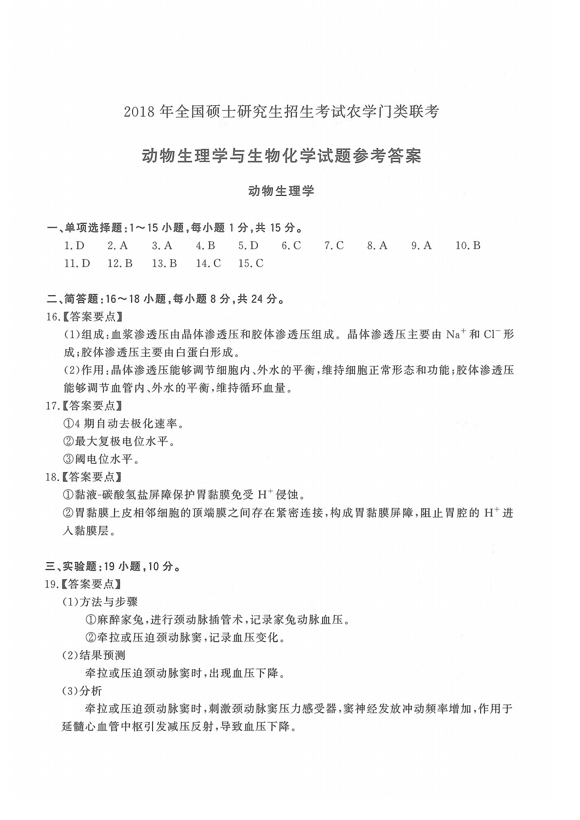 415动物生理与生物化学2018年考研初试真题参考答案