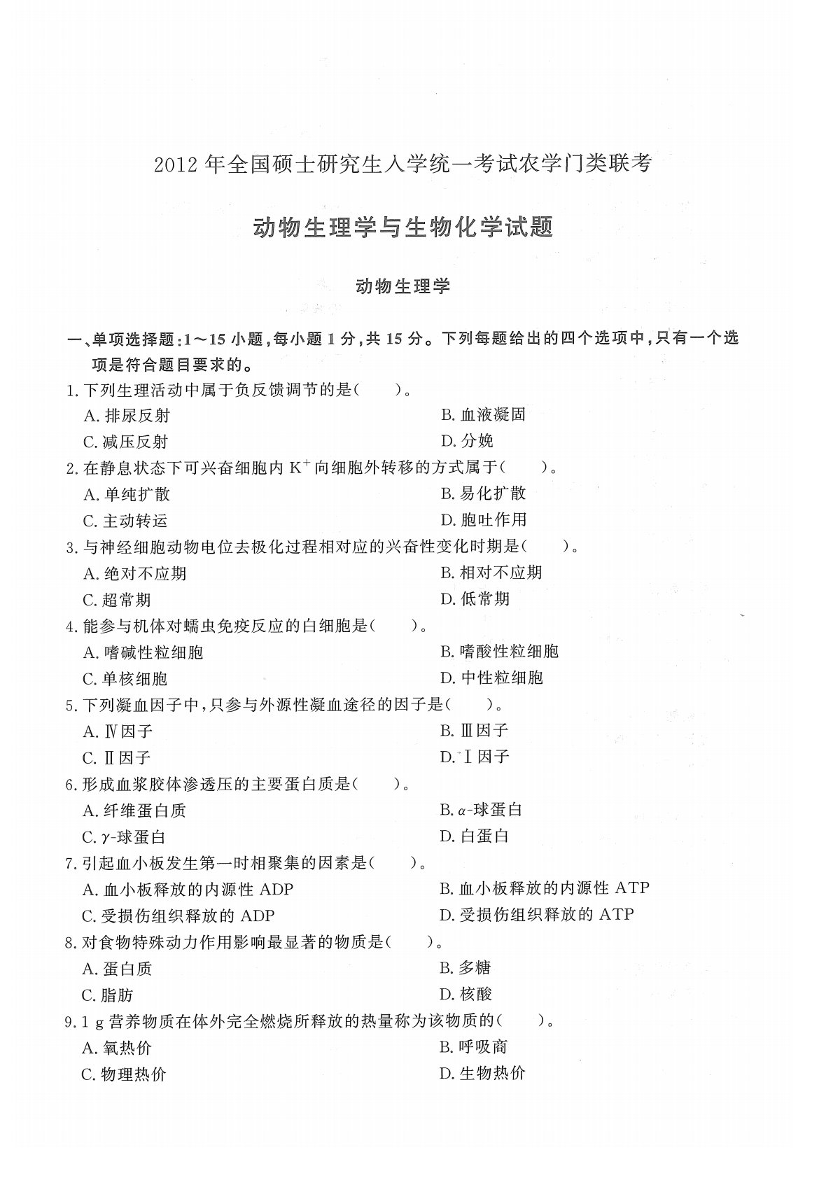 415动物生理与生物化学2012年考研初试真题