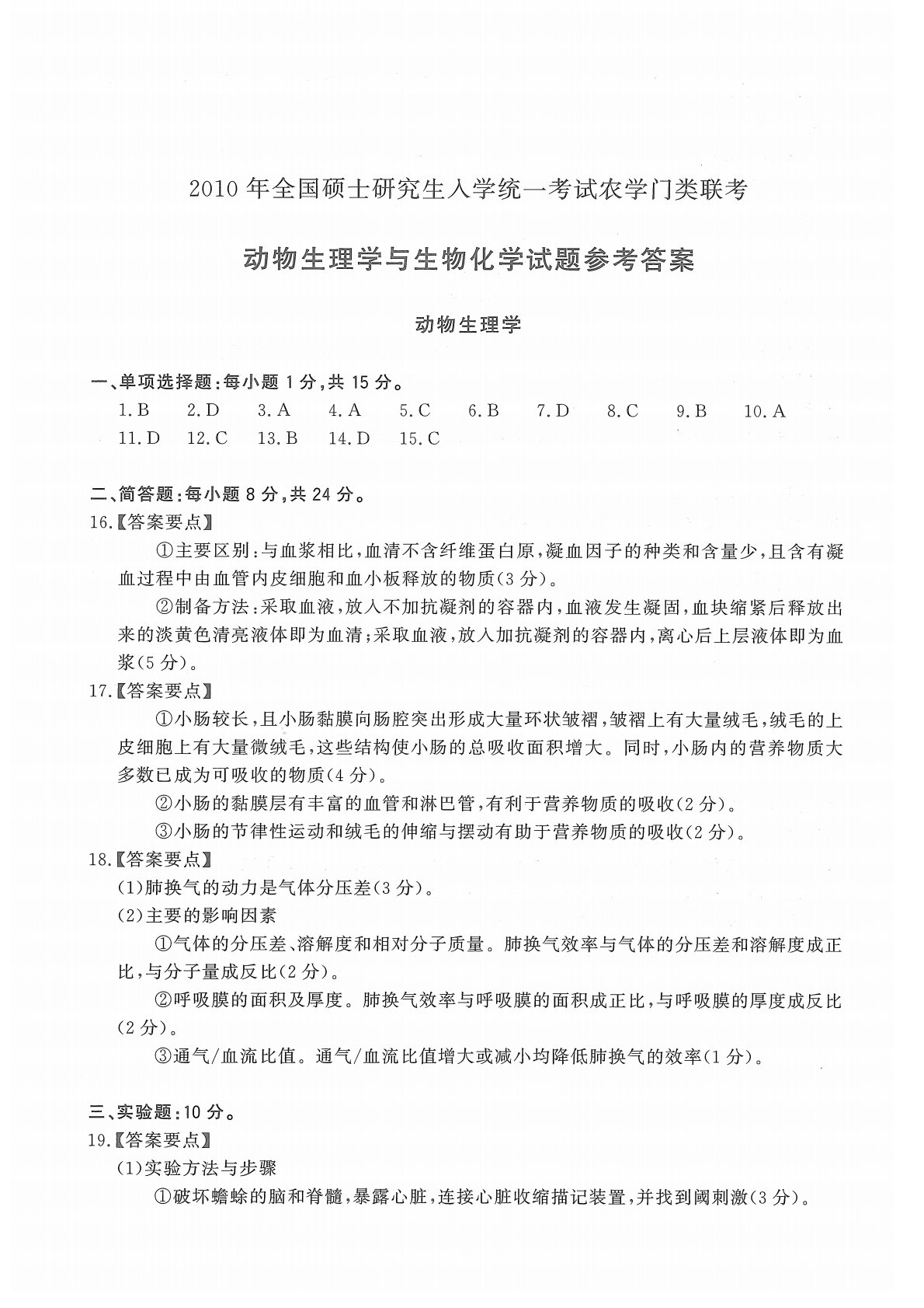 415动物生理与生物化学2010年考研初试真题参考答案