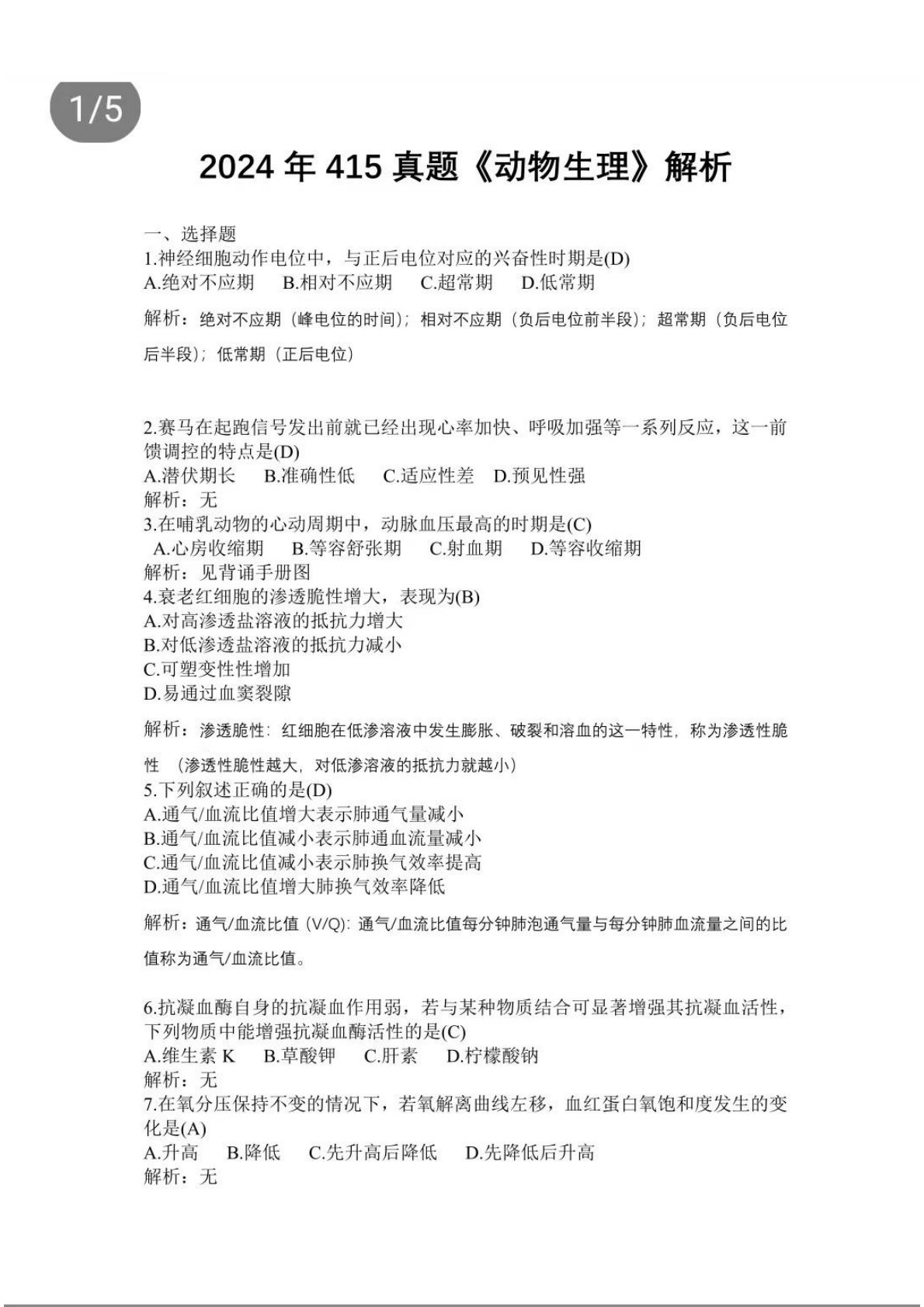 415动物生理与生物化学24年真题