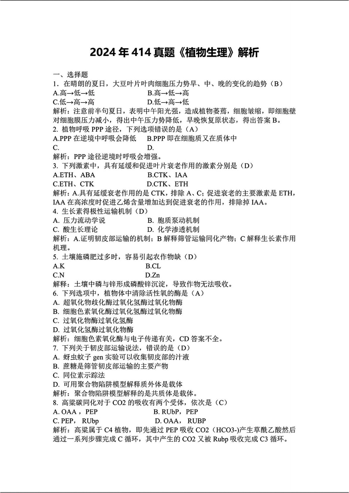 414植物生理与生物化学2024年真题