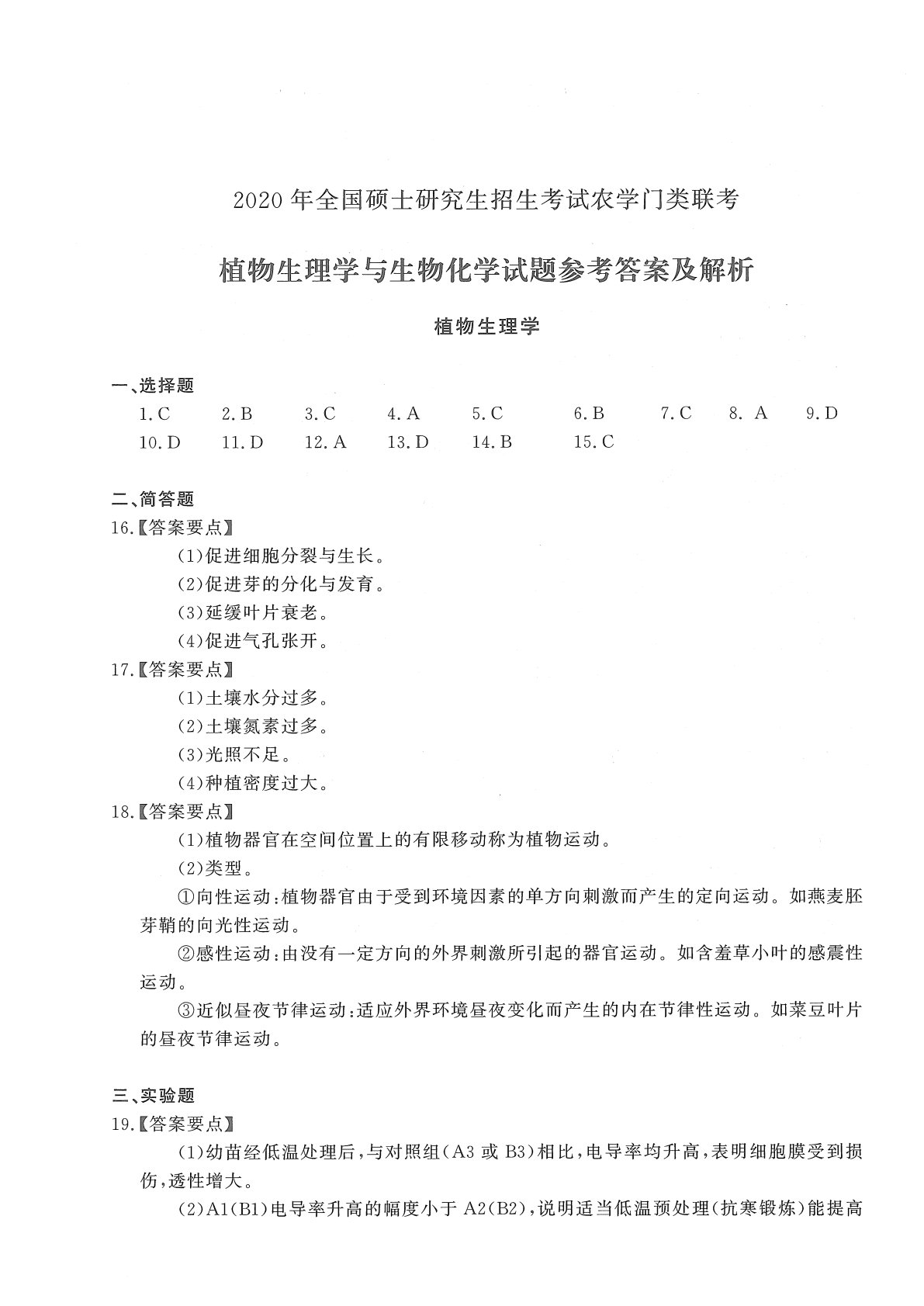 414植物生理与生物化学2020年考研初试真题参考答案
