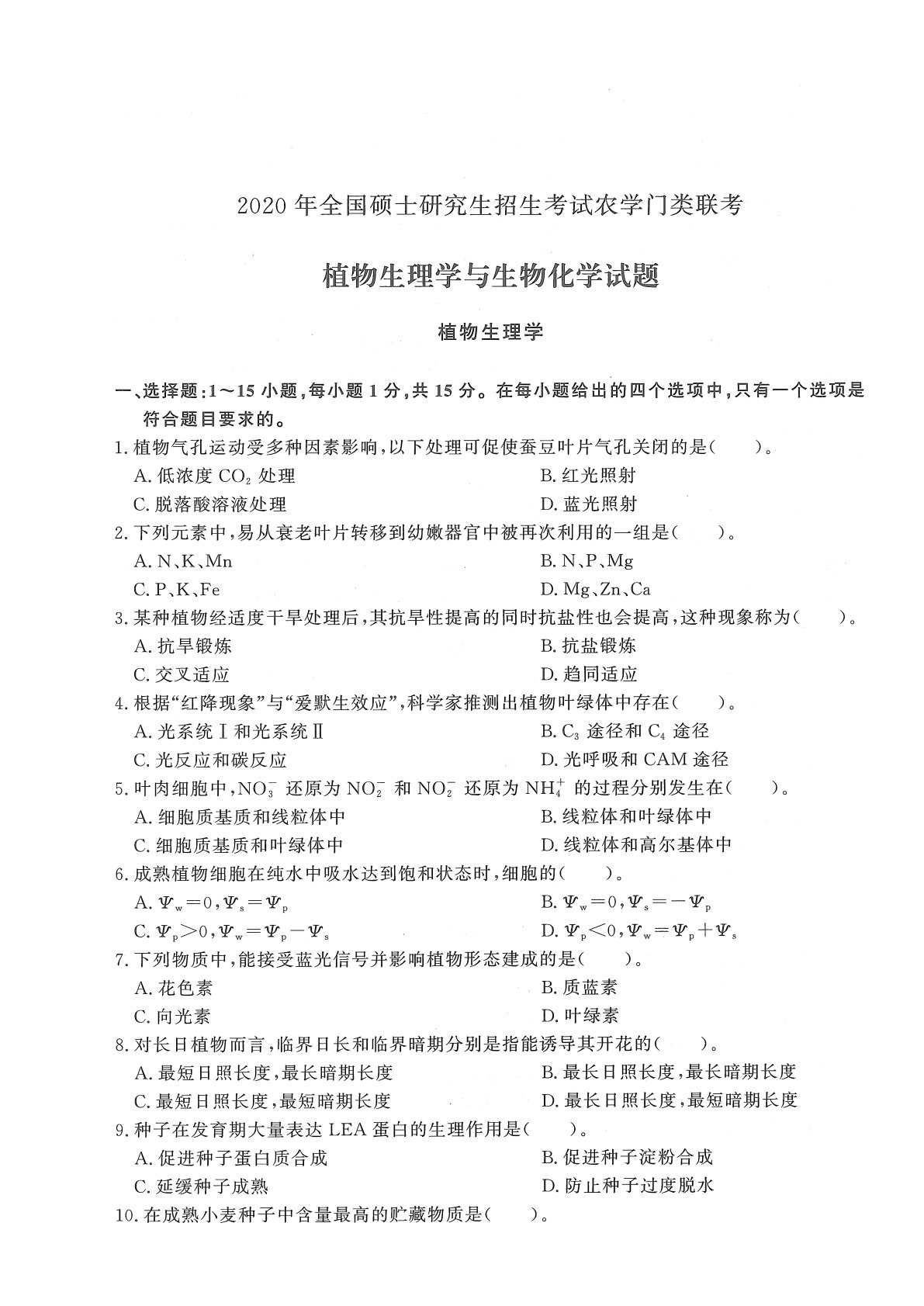 414植物生理与生物化学2020年考研初试真题