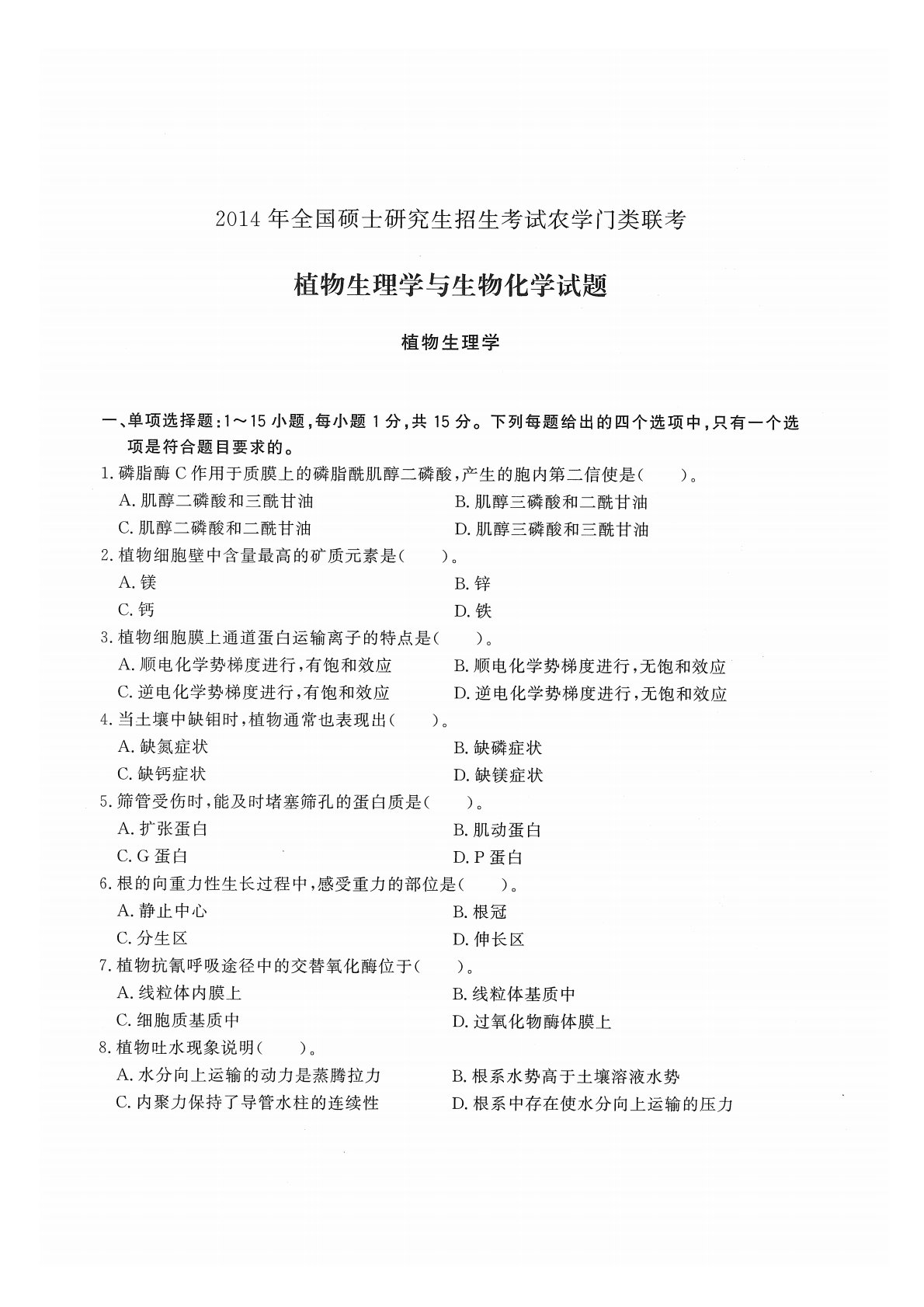 414植物生理与生物化学2014年考研初试真题