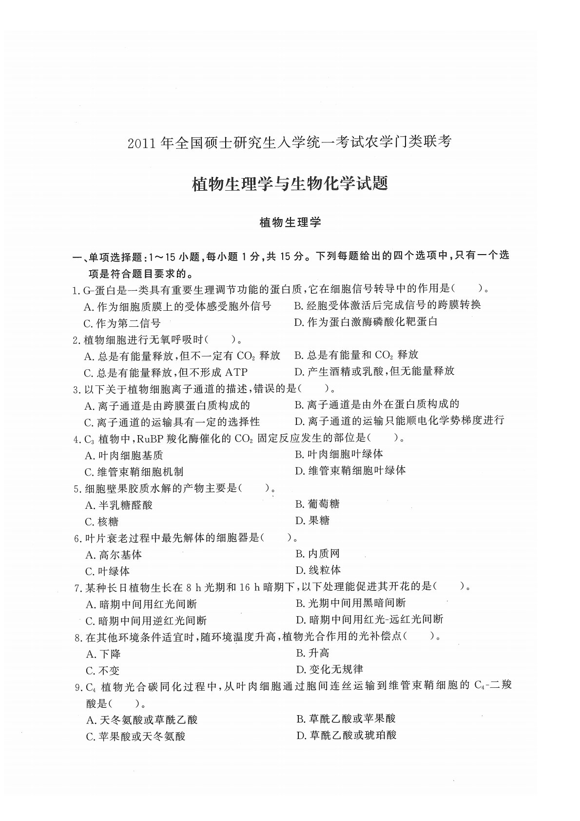 414植物生理与生物化学2011年考研初试真题