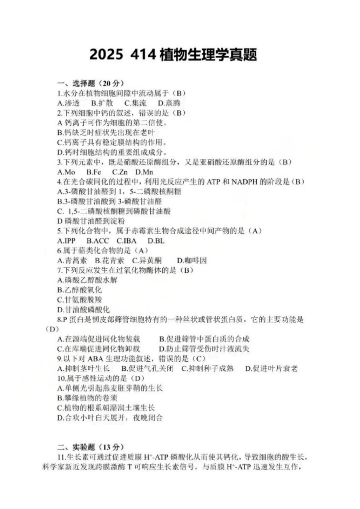 414植物生理与生物化学2025年真题答案