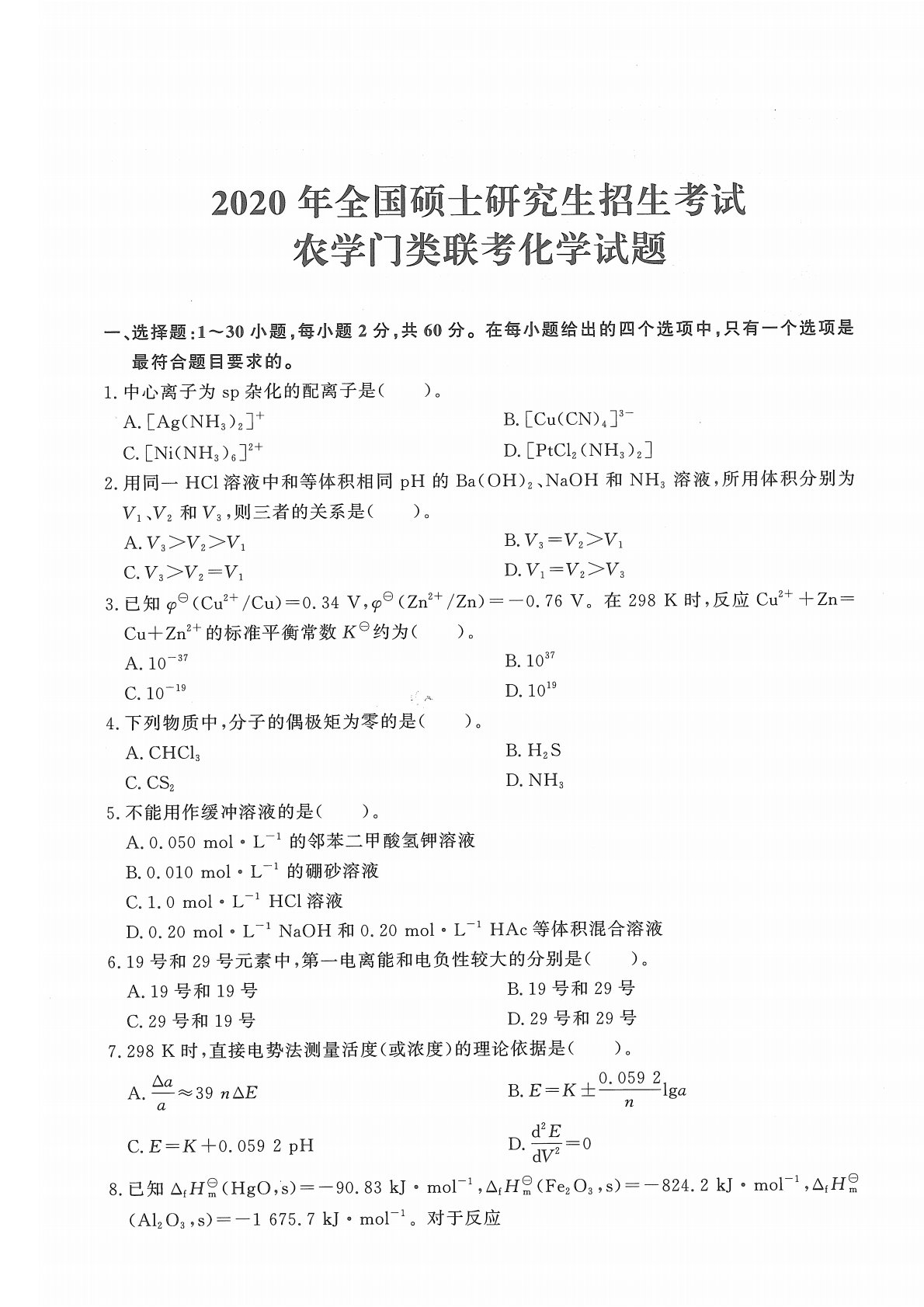 315化学2020年考研初试真题