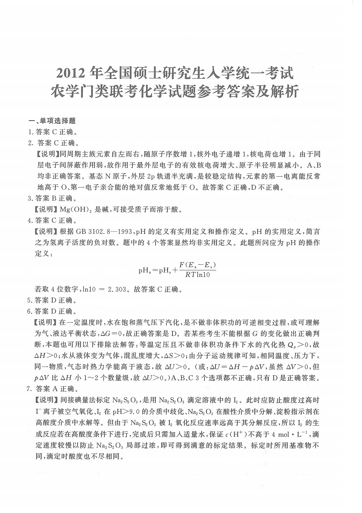 315化学2012年考研初试真题参考答案