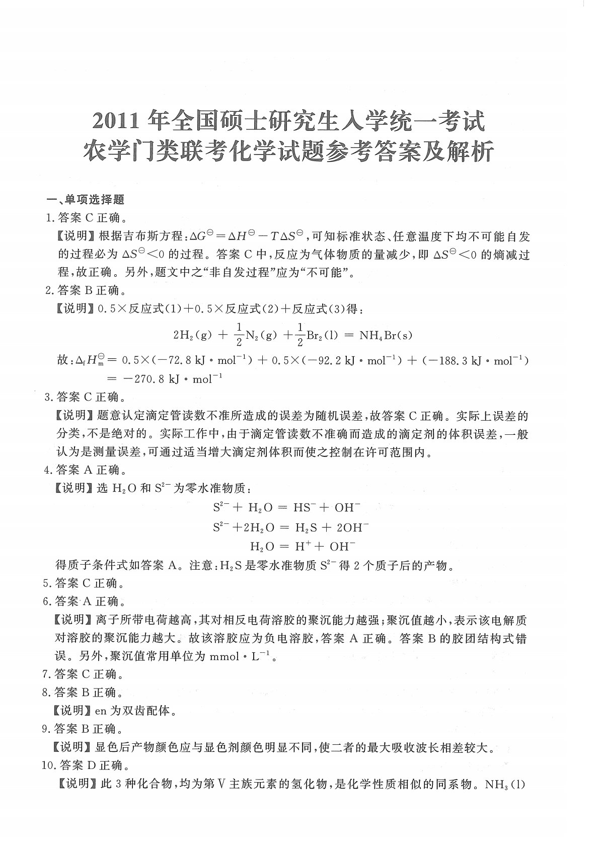 315化学2011年考研初试真题参考答案
