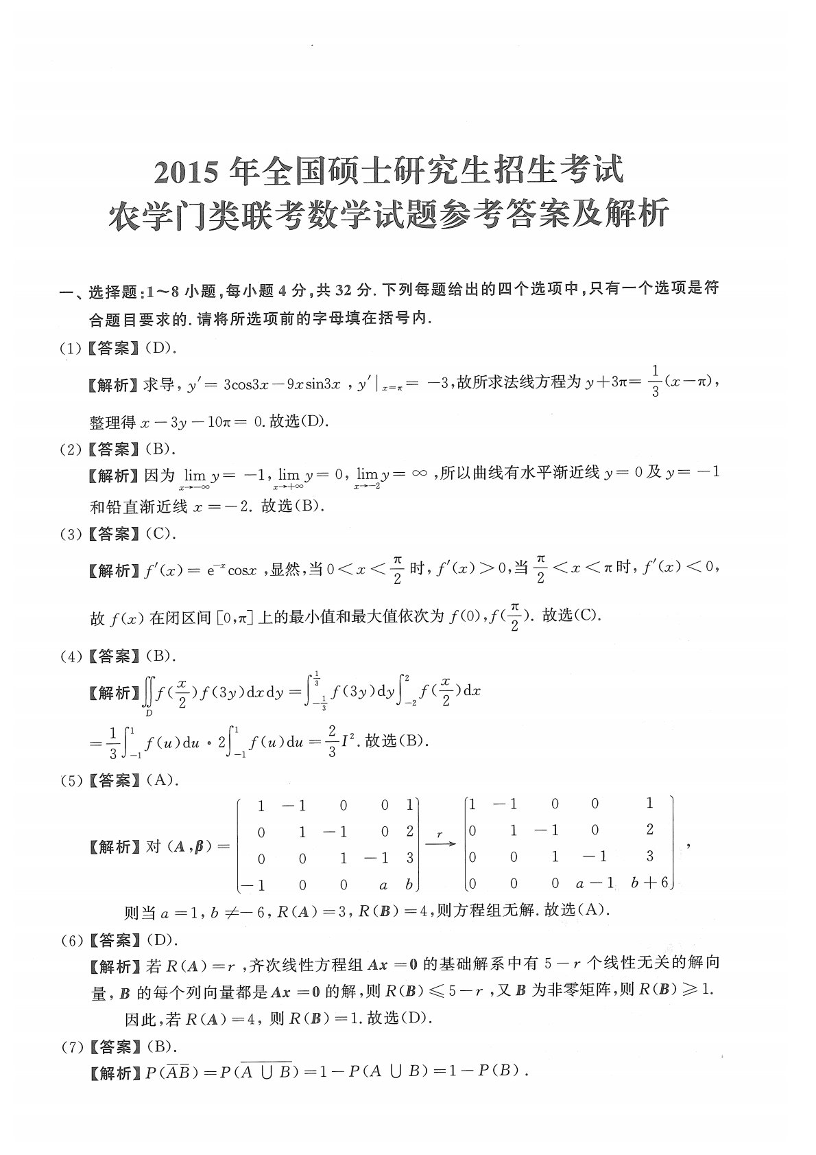 314数学2015年考研初试真题参考答案