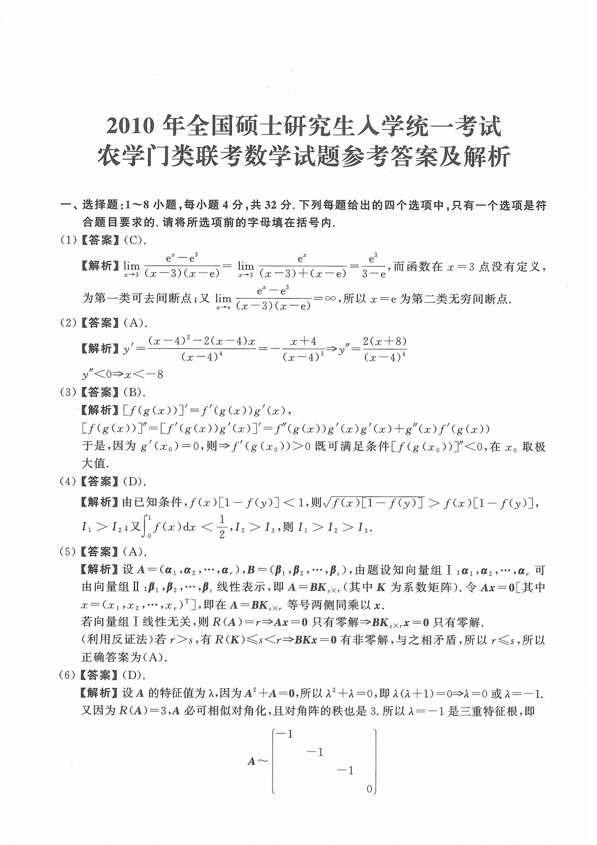314数学2010年考研初试真题参考答案