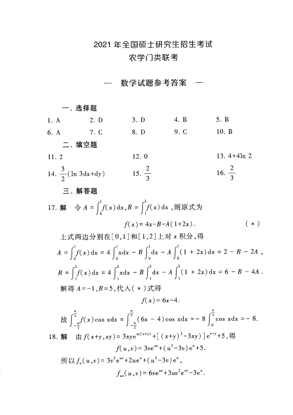 314数学2021年考研初试真题参考答案