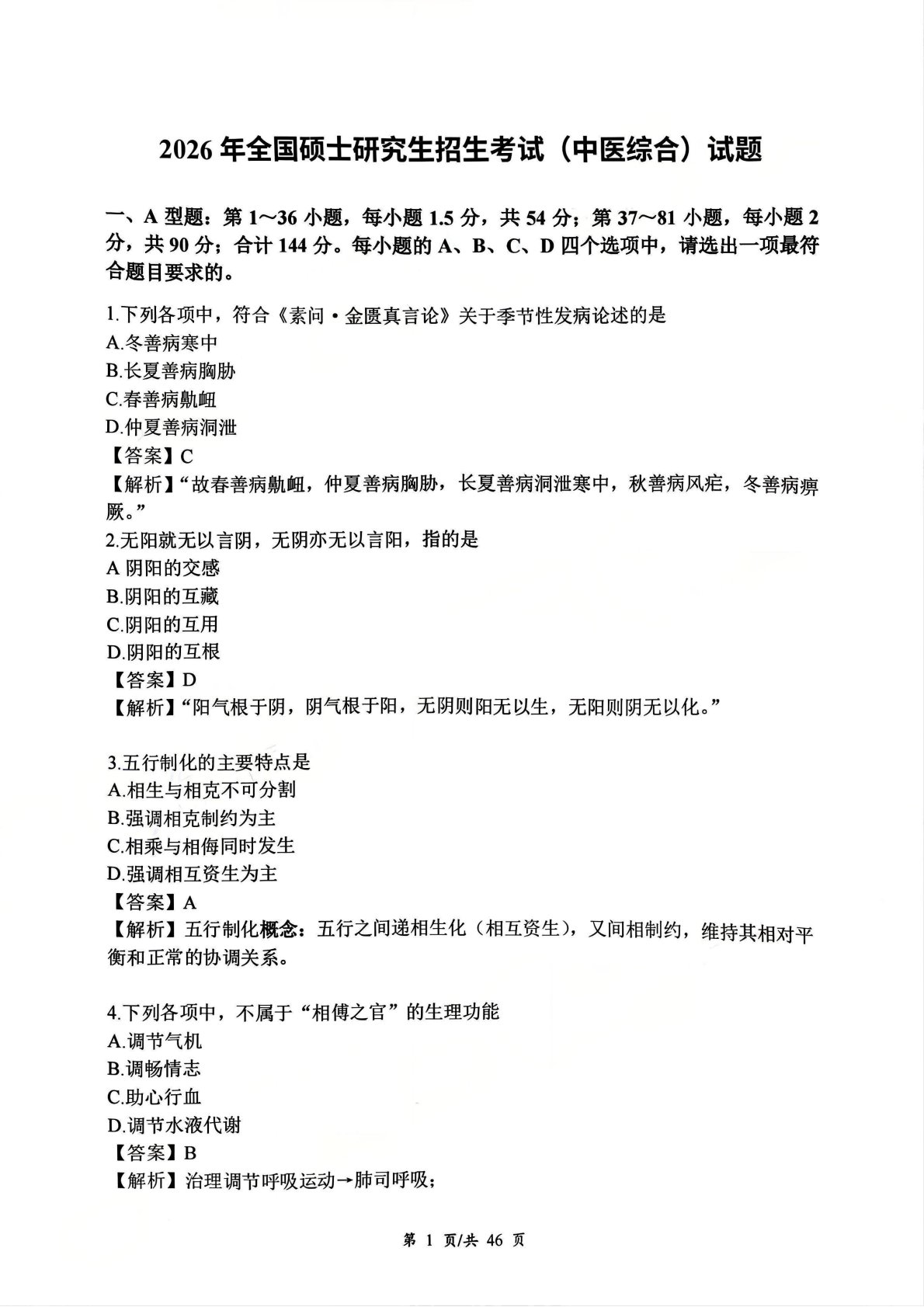 307中医综合2026年真题及答案解析
