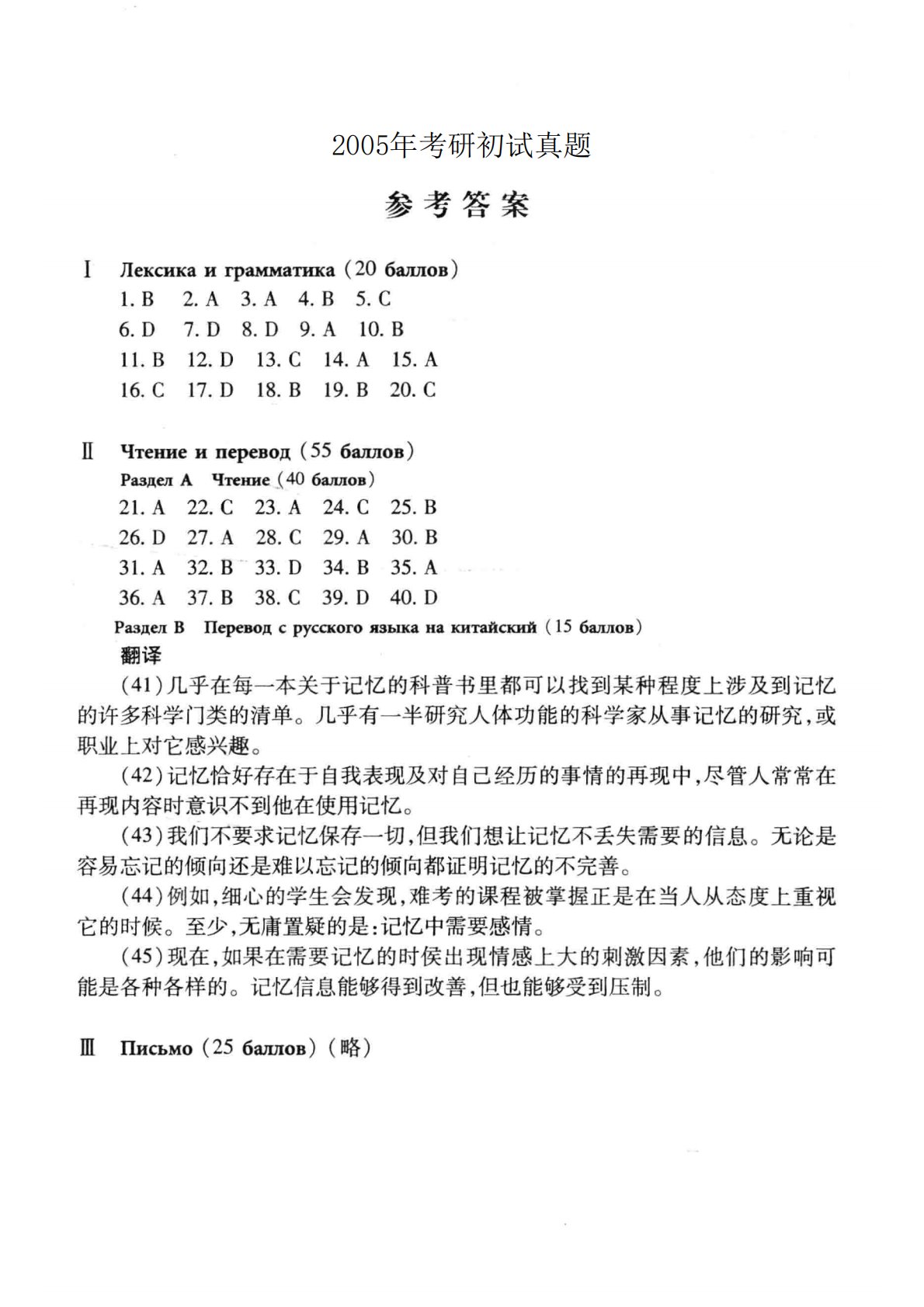 202俄语2005年考研初试真题参考答案