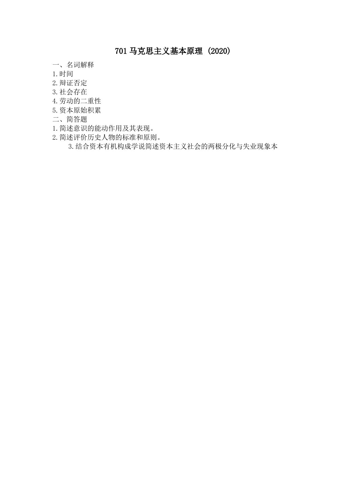 701马克思主义基本原理(2020)一、名词解释1.时间2.辩证否定3.社会存在4.劳动的二重性5.资本原始积累二、简答题1.简述意识的能动作用及其表现。2.简述评价历史人物的标准和原则。3.结合资本有机构成学说简述资本主义社会的两极分化与失业现象本701马克思主义基本原理(2020)一、名词解释1.时间2.辩证否定3.社会存在4.劳动的二重性5.资本原始积累二、简答题1.简述意识的能动作用及其表现。2.简述评价历史人物的标准和原则。3.结合资本有机构成学说简述资本主义社会的两极分化与失业现象本质。4.为什么社会总资本再生产的核心问题是社会总产品的实现问题?三、论述题1.根据主要矛盾和次要矛盾...