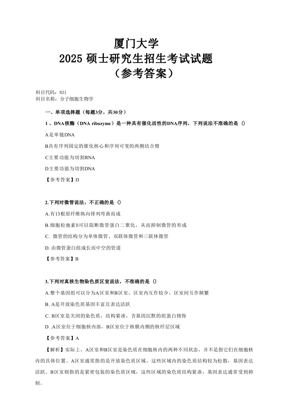 2025年厦门大学831分子细胞生物学真题答案