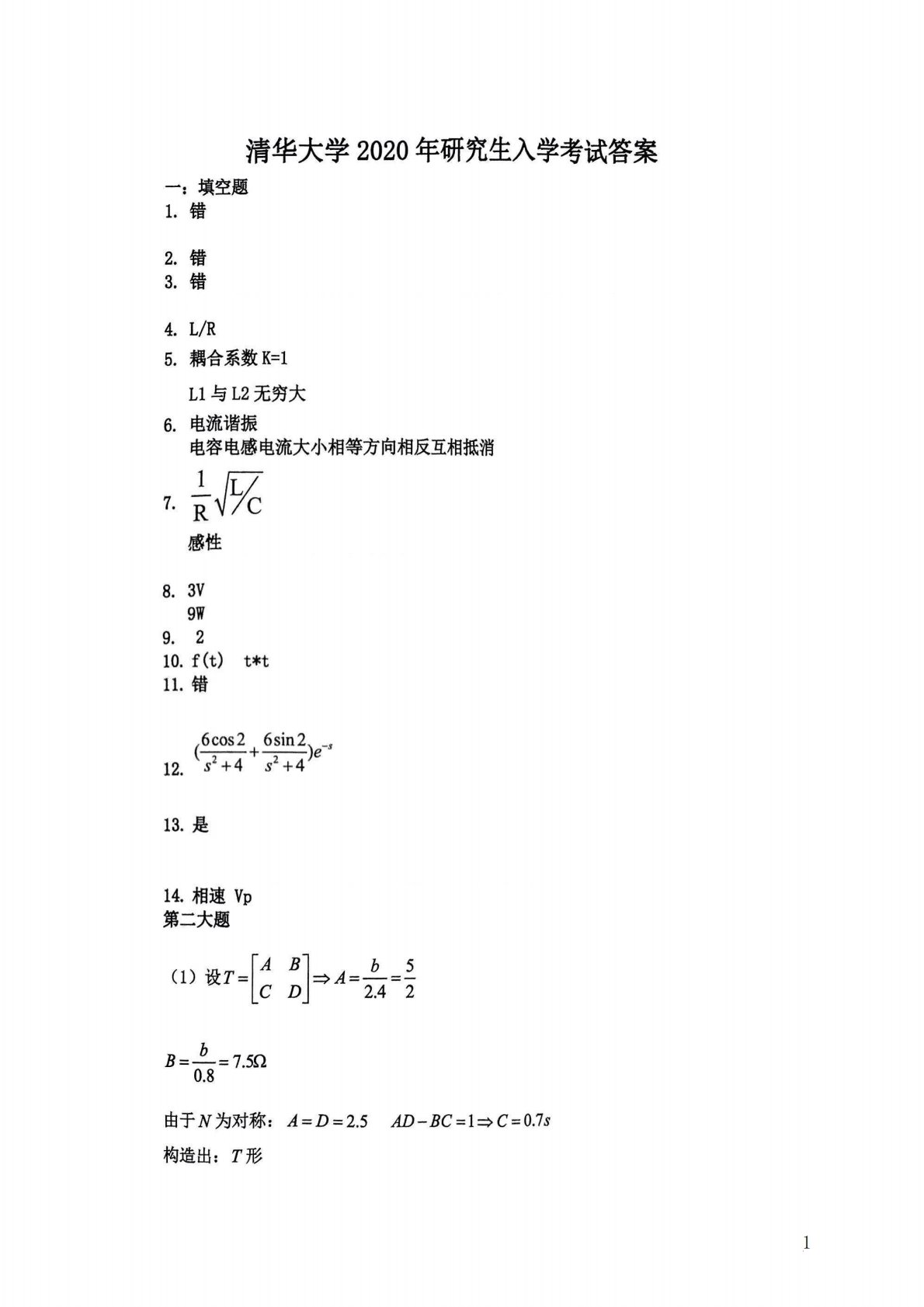 清华大学827电路原理2009年真题答案