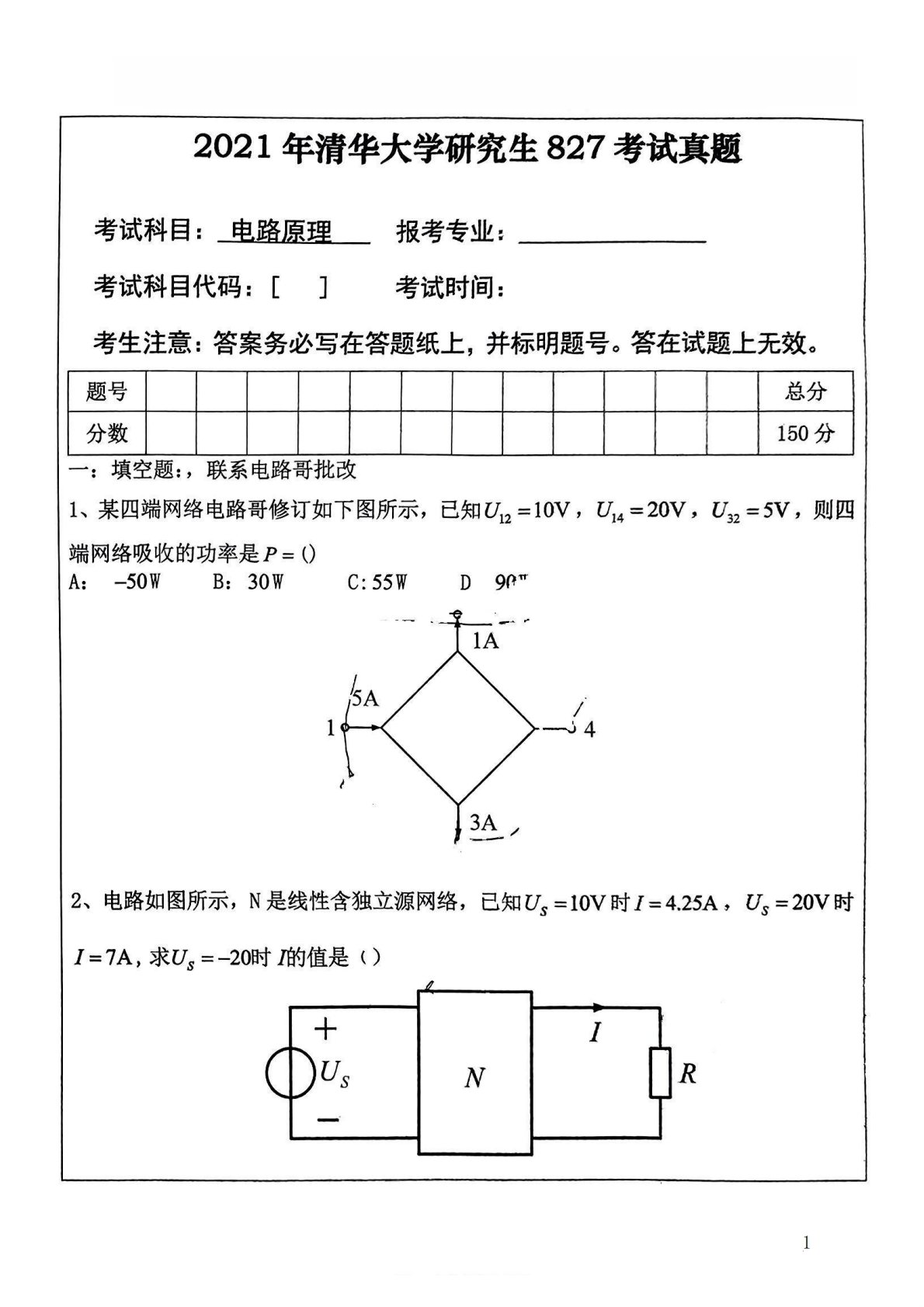 清华大学827电路原理2009年真题