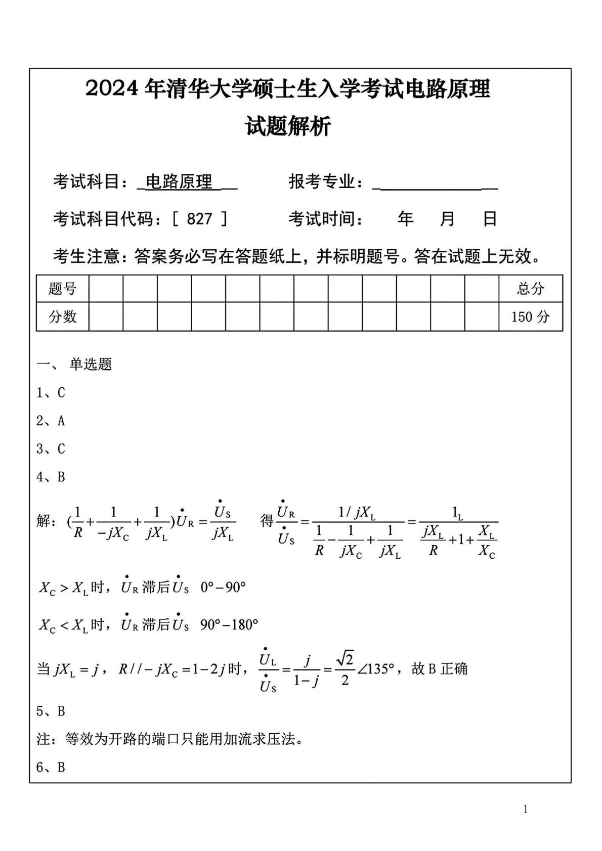 清华大学827电路原理2009年真题答案