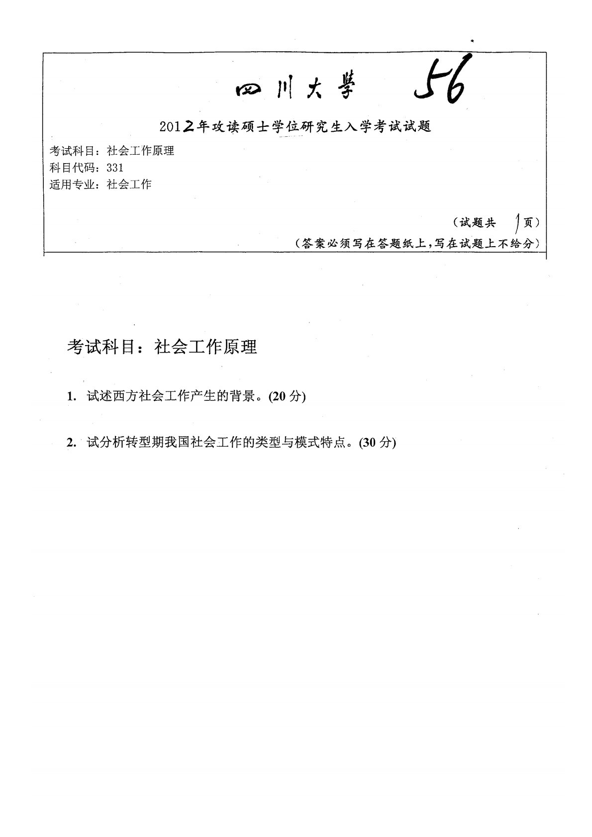 四川大学331社会工作原理2012年真题