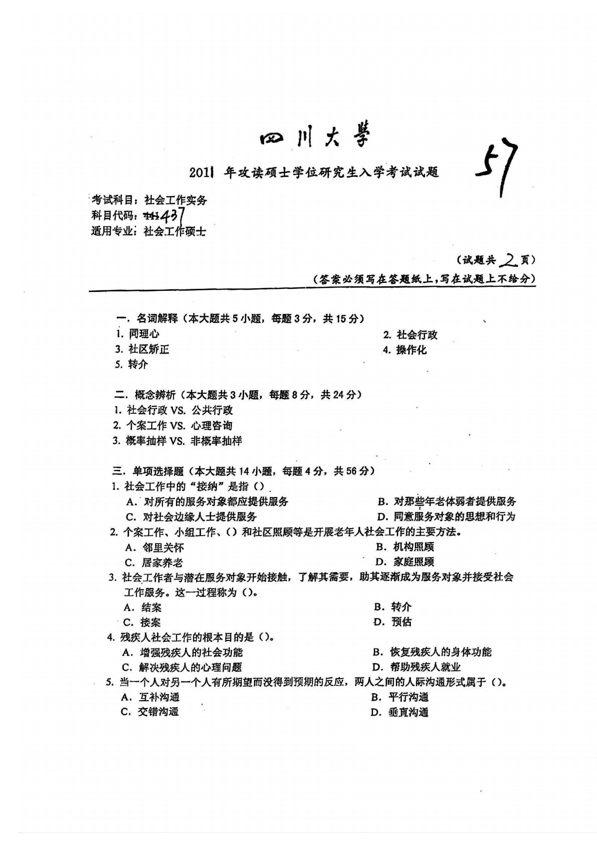 四川大学437社会工作实务2011年真题