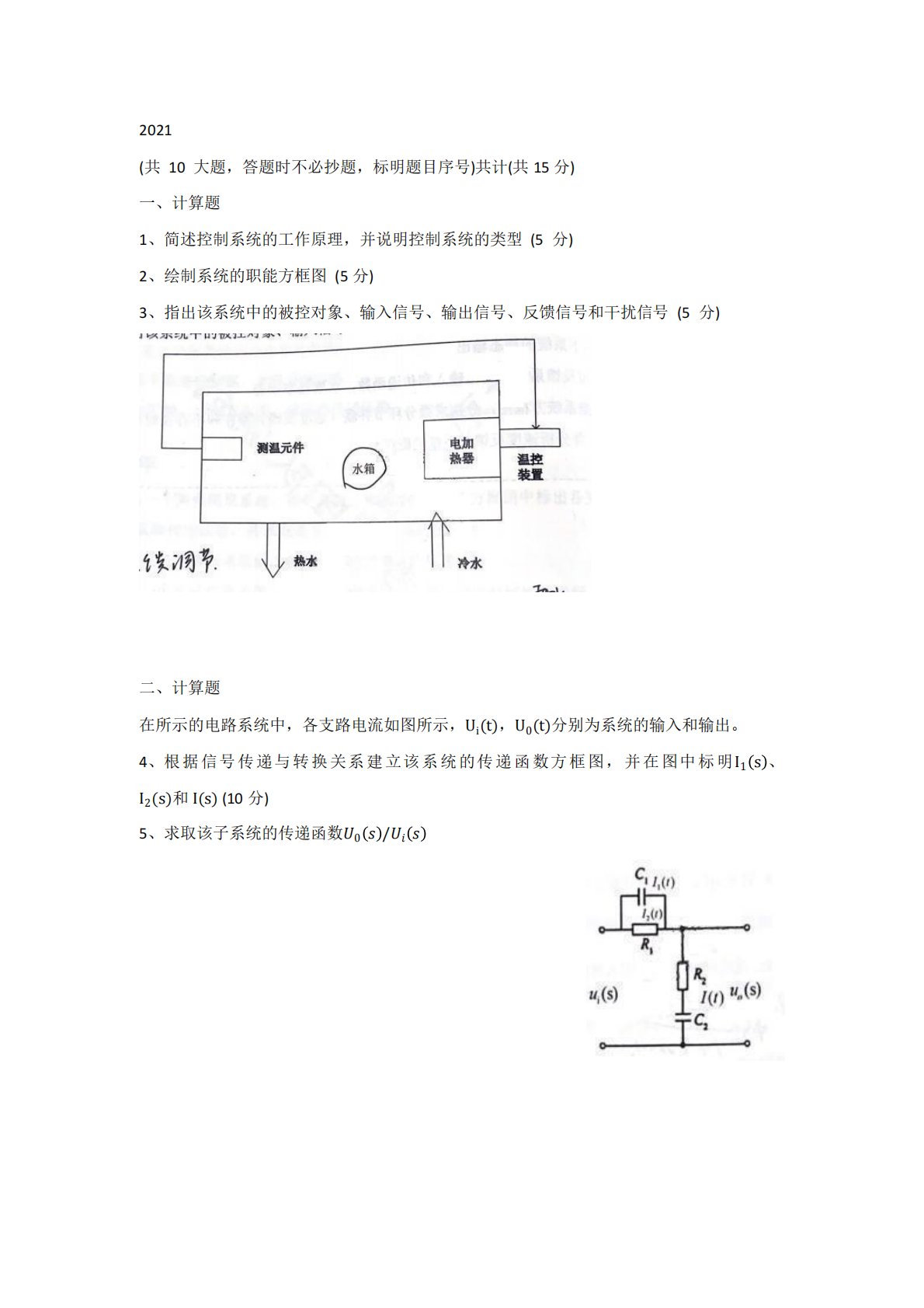 2021(共10大题,答题时不必抄题,标明题目序号)共计(共15分)一、计算题1、简述控制系统的工作原理,并说明控制系统的类型(5分)2、绘制系统的职能方框图(5分)3、指出该系统中的被控对象、输入信号、输出信号、反馈信号和干扰信号(5分)二、计算题在所示的电路系统中,各支路电流如图所示,Ui(t),U0(t)分别为系统的输入和输出。4、根据信号传递与转换关系建立该系统的传递函数方框图,并在图中标明I1s、I2(s)和I(s)(10分)5、求取该子系统的传递函数0/三、计算题某单位负反馈的单位阶跃响应为ct=1−1.8e−4t+0.8e−9t,求6.系统的开环传递函数和闭环传递...