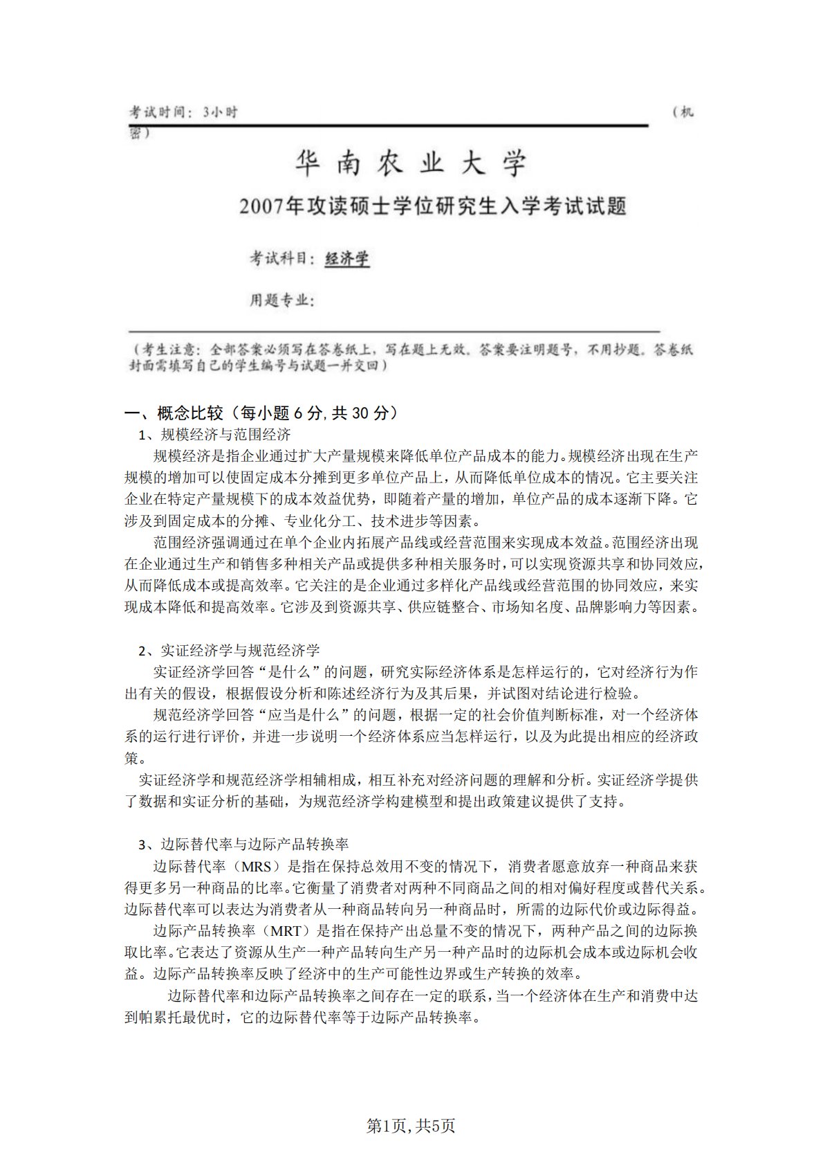 一、概念比较(每小题6分,共30分)1、规模经济与范围经济规模经济是指企业通过扩大产量规模来降低单位产品成本的能力。规模经济出现在生产规模的增加可以使固定成本分摊到更多单位产品上,从而降低单位成本的情况。它主要关注企业在特定产量规模下的成本效益优势,即随着产量的增加,单位产品的成本逐渐下降。它涉及到固定成本的分摊、专业化分工、技术进步等因素。范围经济强调通过在单个企业内拓展产品线或经营范围来实现成本效益。范围经济出现在企业通过生产和销售多种相关产品或提供多种相关服务时,可以实现资源共享和协同效应,从而降低成本或提高效率。它关注的是企业通过多样化产品线或经营范围的协同效应,来实现成本降低和提高效...