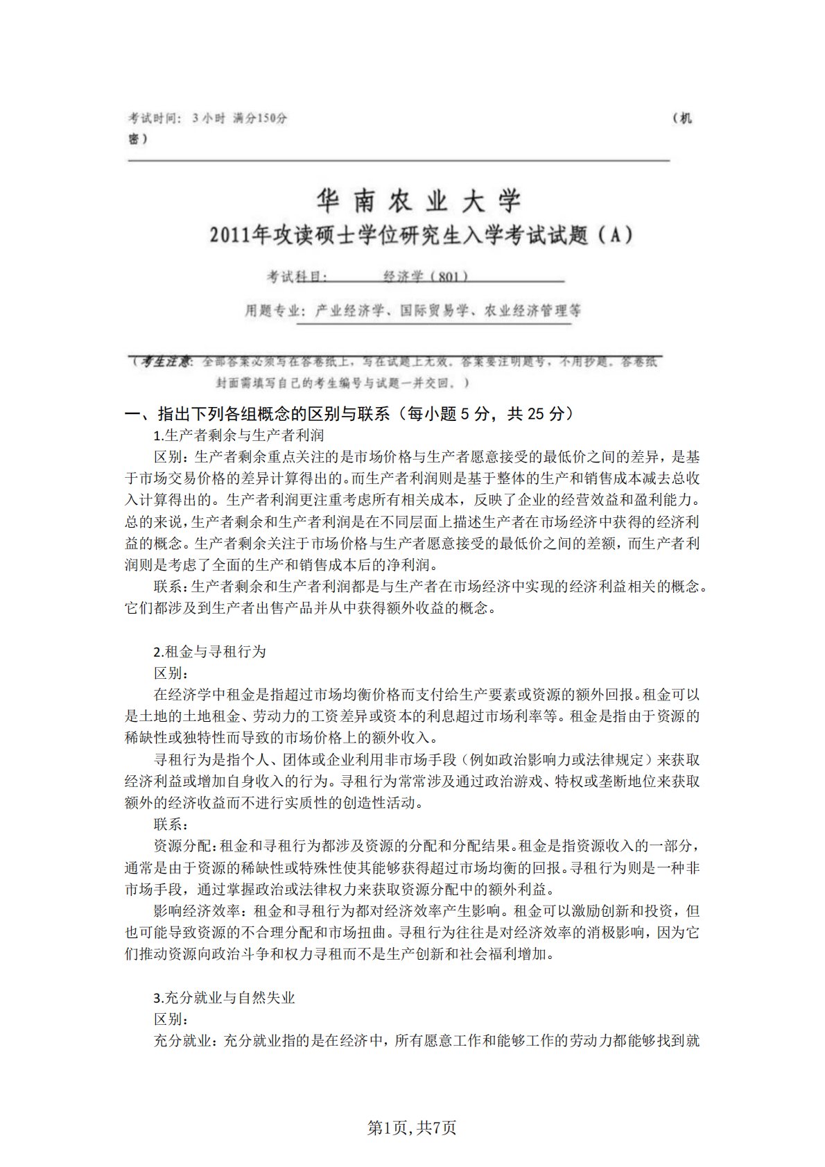 一、指出下列各组概念的区别与联系(每小题5分,共25分)1.生产者剩余与生产者利润区别:生产者剩余重点关注的是市场价格与生产者愿意接受的最低价之间的差异,是基于市场交易价格的差异计算得出的。而生产者利润则是基于整体的生产和销售成本减去总收入计算得出的。生产者利润更注重考虑所有相关成本,反映了企业的经营效益和盈利能力。总的来说,生产者剩余和生产者利润是在不同层面上描述生产者在市场经济中获得的经济利益的概念。生产者剩余关注于市场价格与生产者愿意接受的最低价之间的差额,而生产者利润则是考虑了全面的生产和销售成本后的净利润。联系:生产者剩余和生产者利润都是与生产者在市场经济中实现的经济利益相关的概念。...