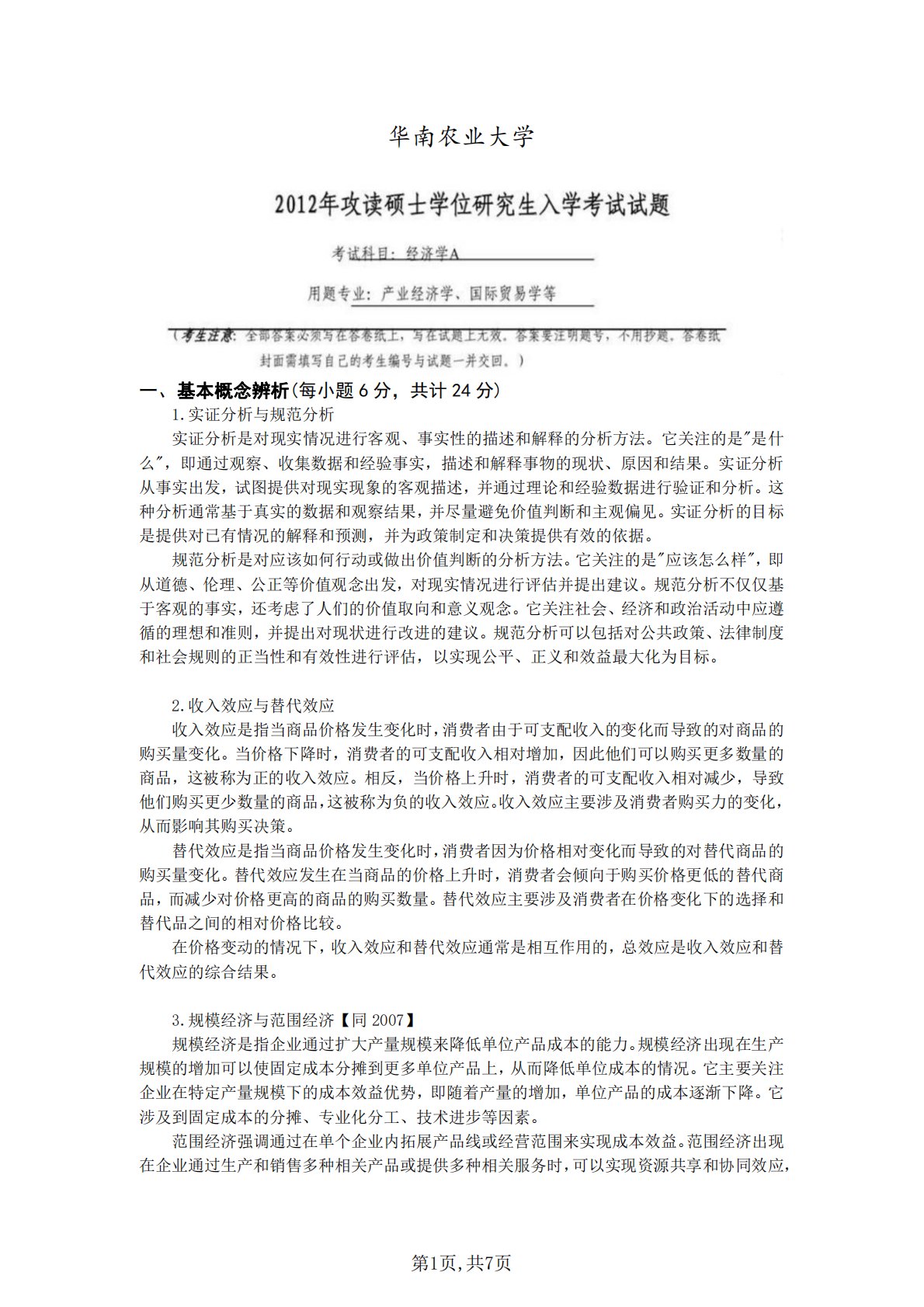 华南农业大学一、基本概念辨析(每小题6分,共计24分)1.实证分析与规范分析实证分析是对现实情况进行客观、事实性的描述和解释的分析方法。它关注的是"是什么",即通过观察、收集数据和经验事实,描述和解释事物的现状、原因和结果。实证分析从事实出发,试图提供对现实现象的客观描述,并通过理论和经验数据进行验证和分析。这种分析通常基于真实的数据和观察结果,并尽量避免价值判断和主观偏见。实证分析的目标是提供对已有情况的解释和预测,并为政策制定和决策提供有效的依据。规范分析是对应该如何行动或做出价值判断的分析方法。它关注的是"应该怎么样",即从道德、伦理、公正等价值观念出发,对现实情况进行评估并提出建议。规...