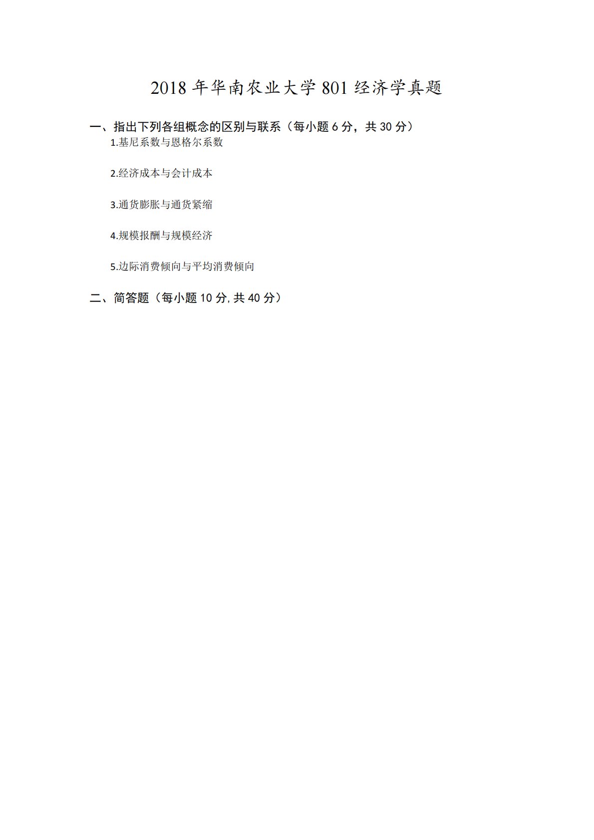 2018年华南农业大学801经济学真题一、指出下列各组概念的区别与联系(每小题6分,共30分)1.基尼系数与恩格尔系数2.经济成本与会计成本3.通货膨胀与通货紧缩4.规模报酬与规模经济5.边际消费倾向与平均消费倾向二、简答题(每小题10分,共40分)2018年华南农业大学801经济学真题一、指出下列各组概念的区别与联系(每小题6分,共30分)1.基尼系数与恩格尔系数2.经济成本与会计成本3.通货膨胀与通货紧缩4.规模报酬与规模经济5.边际消费倾向与平均消费倾向二、简答题(每小题10分,共40分)1.完全竞争市场所具备的条件有哪些?2.什么是自然垄断,政府如何管制自然垄断?3.什么是财政政策的“...