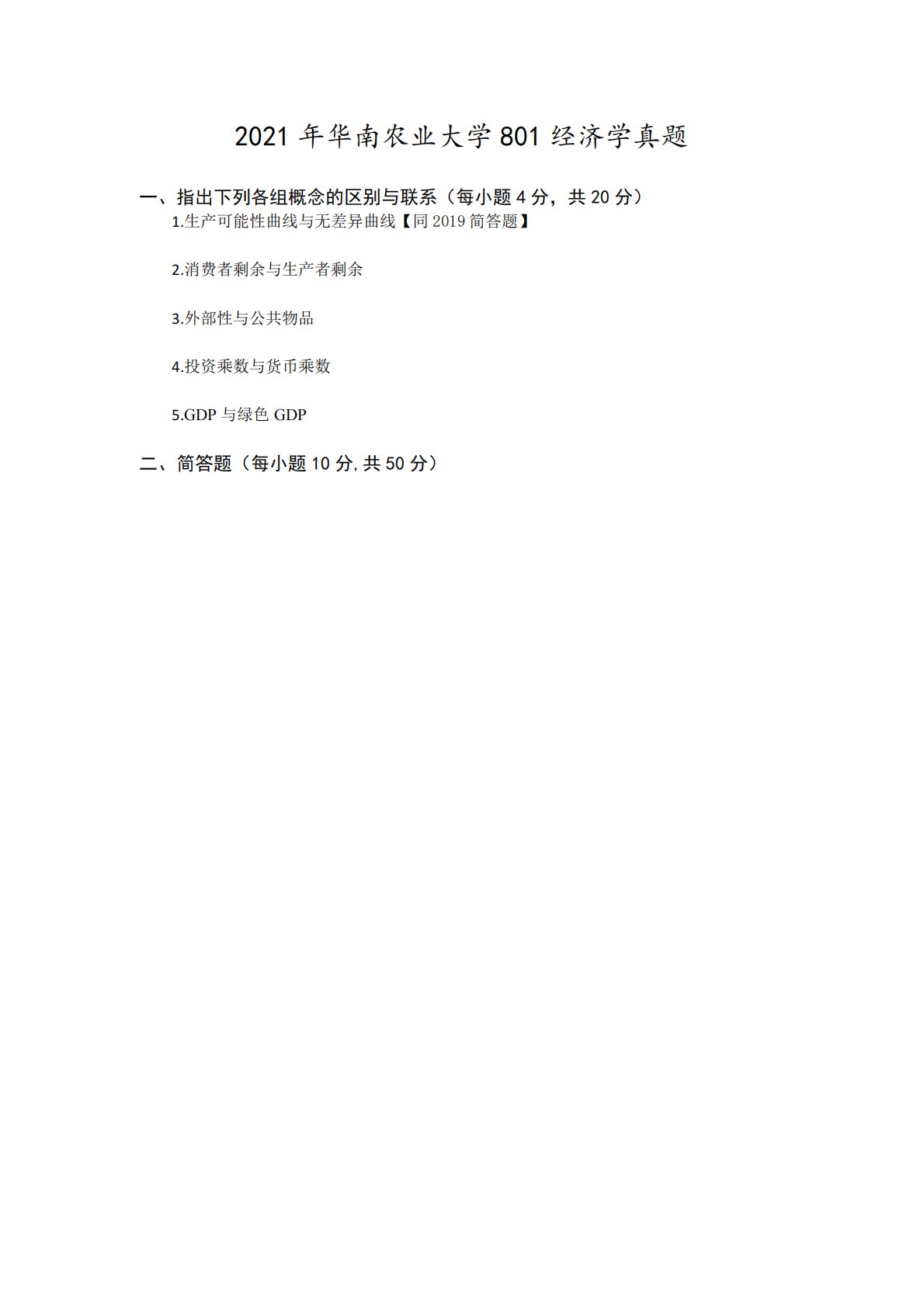 2021年华南农业大学801经济学真题一、指出下列各组概念的区别与联系(每小题4分,共20分)1.生产可能性曲线与无差异曲线【同2019简答题】2.消费者剩余与生产者剩余3.外部性与公共物品4.投资乘数与货币乘数5.GDP与绿色GDP二、简答题(每小题10分,共50分)2021年华南农业大学801经济学真题一、指出下列各组概念的区别与联系(每小题4分,共20分)1.生产可能性曲线与无差异曲线【同2019简答题】2.消费者剩余与生产者剩余3.外部性与公共物品4.投资乘数与货币乘数5.GDP与绿色GDP二、简答题(每小题10分,共50分)1.简述价格歧视的内涵与实施价格歧视的条件,并举例说明。2....