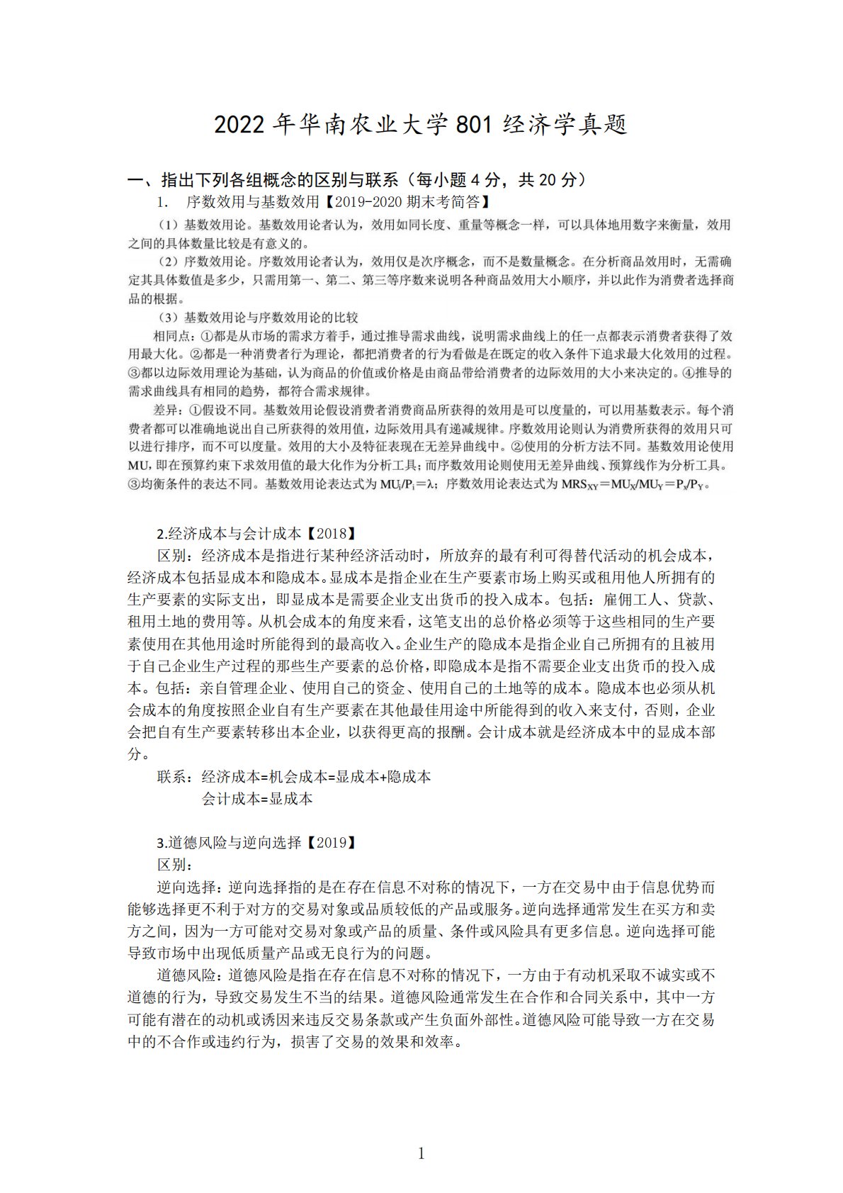 2022年华南农业大学801经济学真题一、指出下列各组概念的区别与联系(每小题4分,共20分)1.序数效用与基数效用【2019-2020期末考简答】2.经济成本与会计成本【2018】区别:经济成本是指进行某种经济活动时,所放弃的最有利可得替代活动的机会成本,经济成本包括显成本和隐成本。显成本是指企业在生产要素市场上购买或租用他人所拥有的生产要素的实际支出,即显成本是需要企业支出货币的投入成本。包括:雇佣工人、贷款、租用土地的费用等。从机会成本的角度来看,这笔支出的总价格必须等于这些相同的生产要素使用在其他用途时所能得到的最高收入。企业生产的隐成本是指企业自己所拥有的且被用于自己企业生产过程的那...