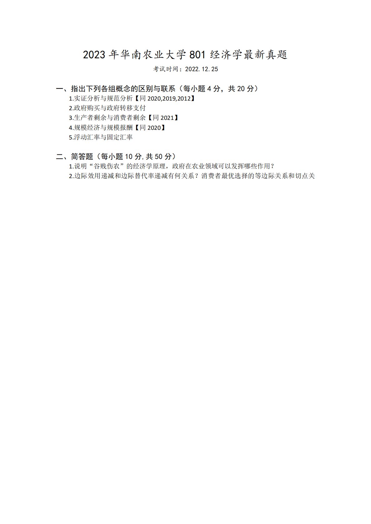 2023年华南农业大学801经济学最新真题考试时间:2022.12.25一、指出下列各组概念的区别与联系(每小题4分,共20分)1.实证分析与规范分析【同2020,2019,2012】2.政府购买与政府转移支付3.生产者剩余与消费者剩余【同2021】4.规模经济与规模报酬【同2020】5.浮动汇率与固定汇率二、简答题(每小题10分,共50分)1.说明“谷贱伤农”的经济学原理,政府在农业领域可以发挥哪些作用?2.边际效用递减和边际替代率递减有何关系?消费者最优选择的等边际关系和切点关2023年华南农业大学801经济学最新真题考试时间:2022.12.25一、指出下列各组概念的区别与联系(每小题4...