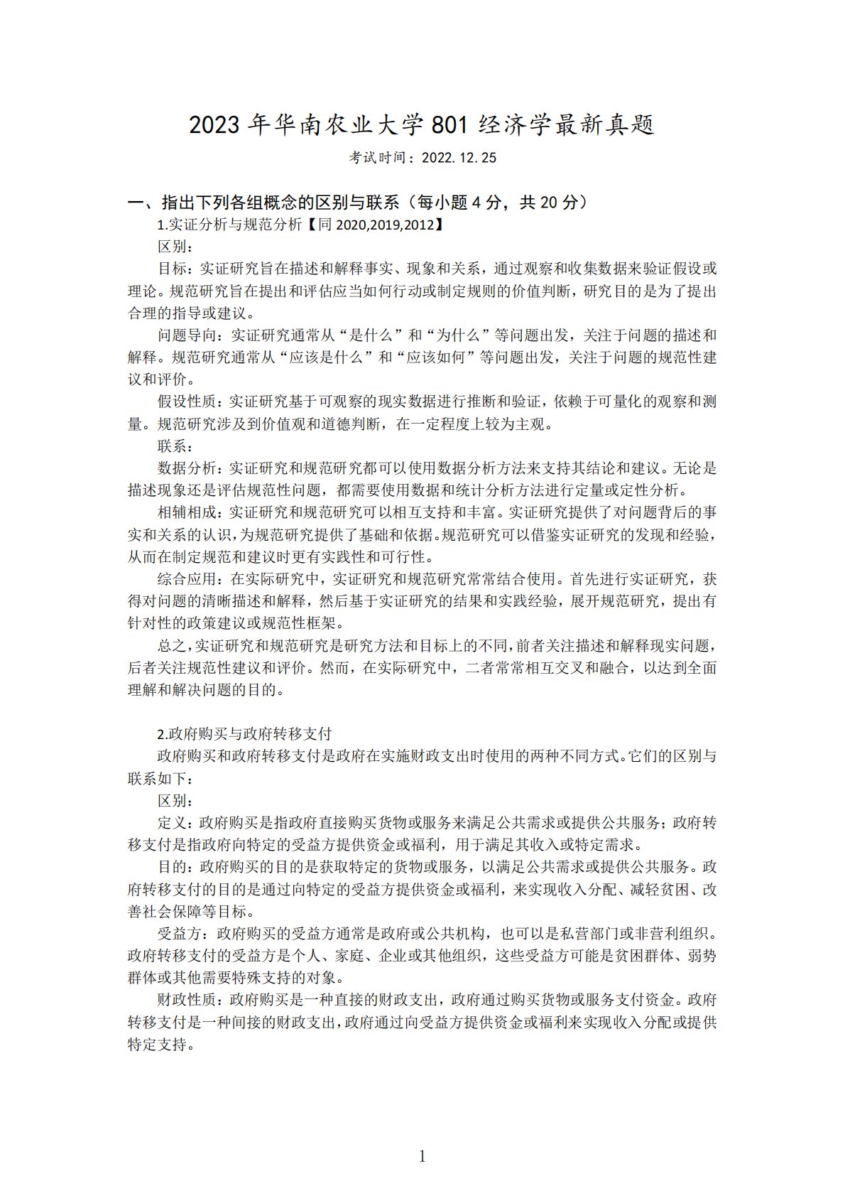 2023年华南农业大学801经济学最新真题考试时间:2022.12.25一、指出下列各组概念的区别与联系(每小题4分,共20分)1.实证分析与规范分析【同2020,2019,2012】区别:目标:实证研究旨在描述和解释事实、现象和关系,通过观察和收集数据来验证假设或理论。规范研究旨在提出和评估应当如何行动或制定规则的价值判断,研究目的是为了提出合理的指导或建议。问题导向:实证研究通常从“是什么”和“为什么”等问题出发,关注于问题的描述和解释。规范研究通常从“应该是什么”和“应该如何”等问题出发,关注于问题的规范性建议和评价。假设性质:实证研究基于可观察的现实数据进行推断和验证,依赖于可量化的观...