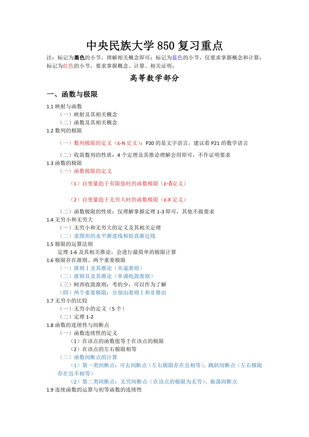 中央民族大学850复习重点注:标记为黑色的小节,理解相关概念即可;标记为蓝色的小节,仅要求掌握概念和计算;标记为红色的小节,要求掌握概念、计算、相关证明。高等数学部分一、函数与极限1.1映射与函数(一)映射及其相关概念(二)函数及其相关概念1.2数列的极限(一)数列极限的定义(ε-N定义):P20的是文字语言,建议看P21的数学语言(二)收敛数列的性质:4个定理及其推论理解会用即可,不作证明要求1.3函数的极限(一)函数极限的定义(1)自变量趋于有限值时的函数极限(ε-δ定义)(2)自变量趋于无穷大时的函数极限(ε-X定义)(二)函数极限的性质:仅理解掌握定理1-3即可,其他不做要求1.4无穷...