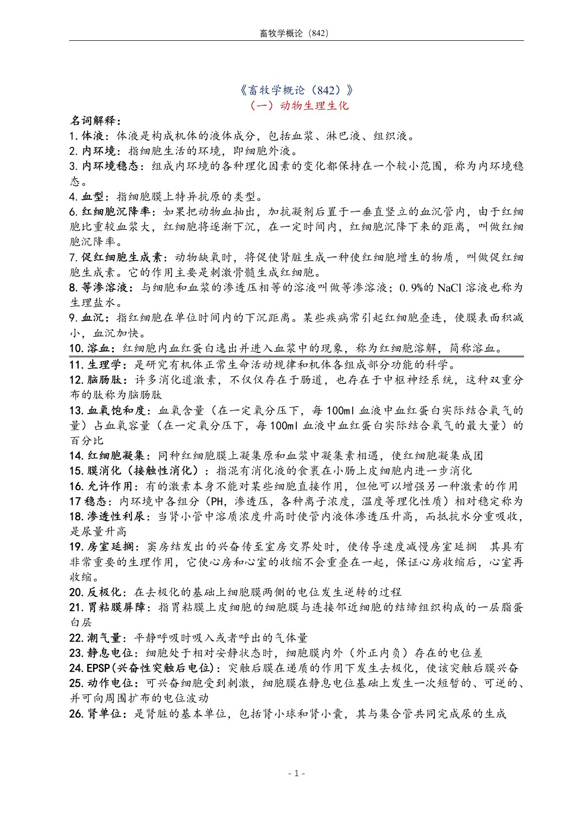 《畜牧学概论(842)》(一)动物生理生化名词解释:1.体液:体液是构成机体的液体成分,包括血浆、淋巴液、组织液。2.内环境:指细胞生活的环境,即细胞外液。3.内环境稳态:组成内环境的各种理化因素的变化都保持在一个较小范围,称为内环境稳态。4.血型:指细胞膜上特异抗原的类型。6.红细胞沉降率:如果把动物血抽出,加抗凝剂后置于一垂直竖立的血沉管内,由于红细胞比重较血浆大,红细胞将逐渐下沉,在一定时间内,红细胞沉降下来的距离,叫做红细胞沉降率。7.促红细胞生成素:动物缺氧时,将促使肾脏生成一种使红细胞增生的物质,叫做促红细胞生成素。它的作用主要是刺激骨髓生成红细胞。8.等渗溶液:与细胞和血浆的渗透...