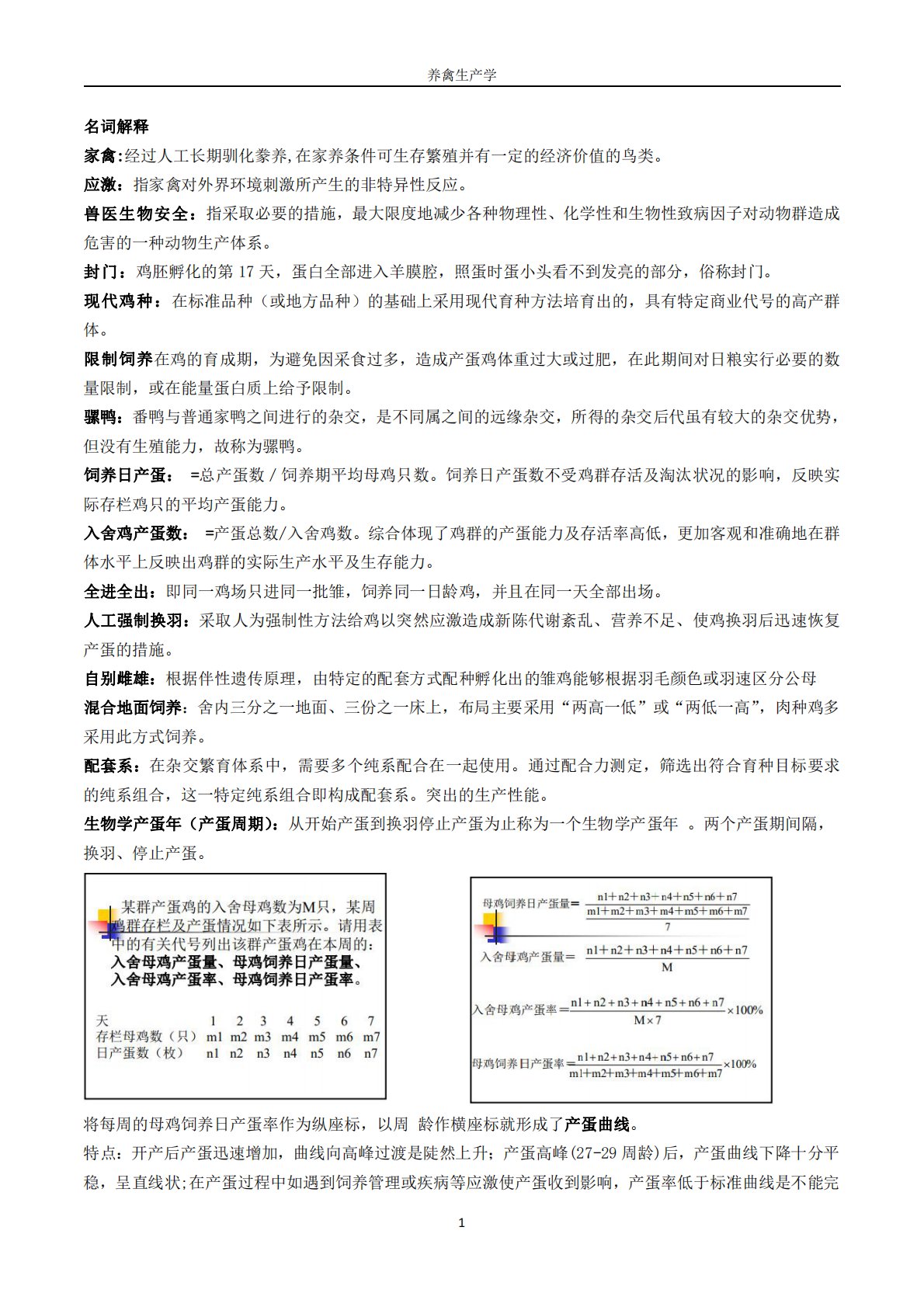 养禽生产学1名词解释家禽:经过人工长期驯化豢养,在家养条件可生存繁殖并有一定的经济价值的鸟类。应激:指家禽对外界环境刺激所产生的非特异性反应。兽医生物安全:指采取必要的措施,最大限度地减少各种物理性、化学性和生物性致病因子对动物群造成危害的一种动物生产体系。封门:鸡胚孵化的第17天,蛋白全部进入羊膜腔,照蛋时蛋小头看不到发亮的部分,俗称封门。现代鸡种:在标准品种(或地方品种)的基础上采用现代育种方法培育出的,具有特定商业代号的高产群体。限制饲养在鸡的育成期,为避免因采食过多,造成产蛋鸡体重过大或过肥,在此期间对日粮实行必要的数量限制,或在能量蛋白质上给予限制。骡鸭:番鸭与普通家鸭之间进行的杂交...