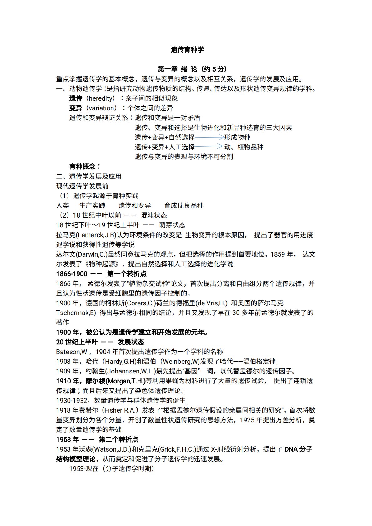 遗传育种学第一章绪论(约5分)重点掌握遗传学的基本概念,遗传与变异的概念以及相互关系,遗传学的发展及应用。一、动物遗传学:是指研究动物遗传物质的结构、传递、传达以及形状遗传变异规律的学科。遗传(heredity):亲子间的相似现象变异(variation):个体之间的差异 遗传和变异辩证关系:遗传和变异是一对矛盾 遗传、变异和选择是生物进化和新品种选育的三大因素遗传+变异+自然选择形成物种遗传+变异+人工选择动、植物品种遗传与变异的表现与环境不可分割育种概念:二、遗传学发展及应用现代遗传学发展前(1)遗传学起源于育种实践人类生产实践遗传和变异育成优良品种(2)18世纪中叶以前──混沌状态18世...