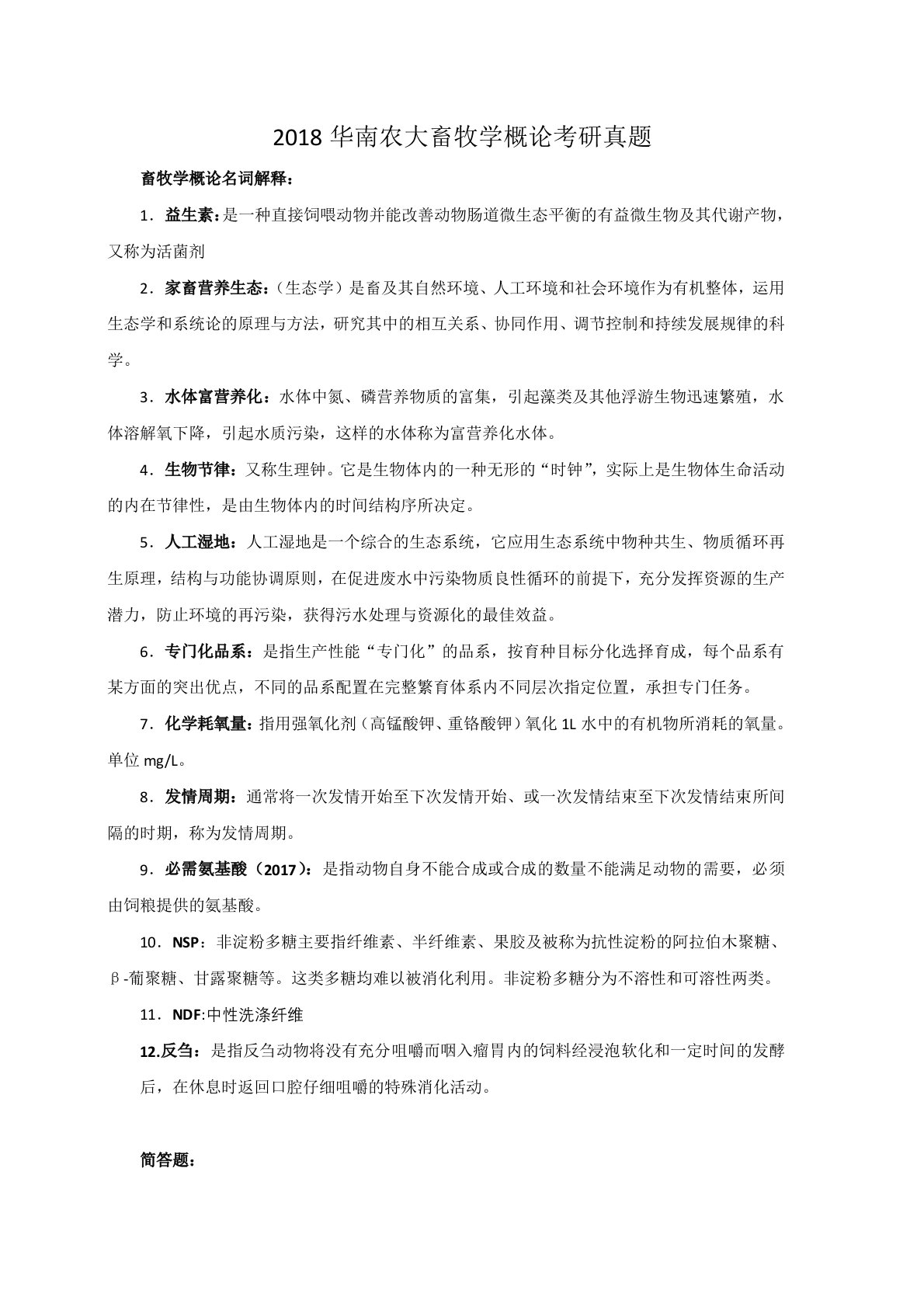 2018华南农大畜牧学概论考研真题畜牧学概论名词解释:益生素:是一种直接饲喂动物并能改善动物肠道微生态平衡的有益微生物及其代谢产物,又称为活菌剂家畜营养生态:(生态学)是畜及其自然环境、人工环境和社会环境作为有机整体,运用生态学和系统论的原理与方法,研究其中的相互关系、协同作用、调节控制和持续发展规律的科学。水体富营养化:水体中氮、磷营养物质的富集,引起藻类及其他浮游生物迅速繁殖,水体溶解氧下降,引起水质污染,这样的水体称为富营养化水体。生物节律:又称生理钟。它是生物体内的一种无形的“时钟”,实际上是生物体生命活动的内在节律性,是由生物体内的时间结构序所决定。人工湿地:人工湿地是一个综合的生态...