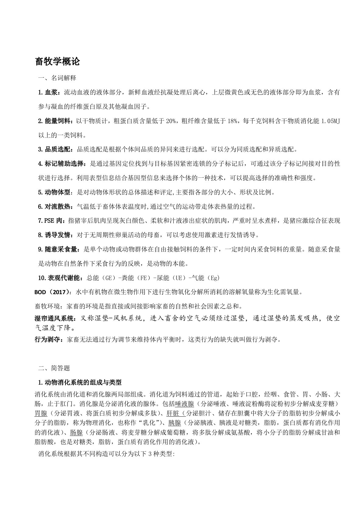 畜牧学概论名词解释1.血浆:流动血液的液体部分,新鲜血液经抗凝处理后离心,上层微黄色或无色的液体部分即为血浆,含有参与凝血的纤维蛋白原及其他凝血因子。2.能量饲料:以干物质计,粗蛋白质含量低于20%,粗纤维含量低于18%,每千克饲料含干物质消化能1.05MJ以上的一类饲料。3.品质选配:品质选配是根据个体间品质的异同来进行选配。可以分为同质选配和异质选配。4.标记辅助选择:是通过基因定位找到与目标基因紧密连锁的分子标记后,可通过该分子标记间接对目的性状进行选择。利用表型信息结合基因型信息来选择个体的一种技术,可以提高选择的准确性和强度。5.动物体型:是对动物体形状的总体描述和评定,主要指各部分...