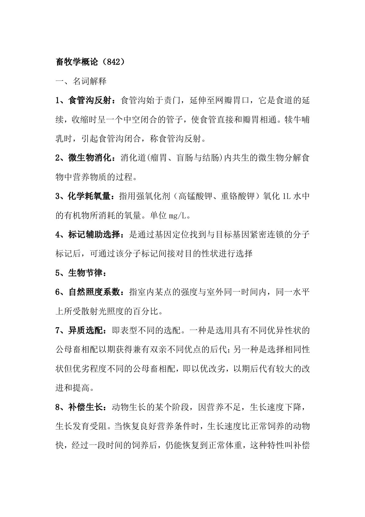 畜牧学概论(842)一、名词解释1、食管沟反射:食管沟始于责门,延伸至网瓣胃口,它是食道的延续,收缩时呈一个中空闭合的管子,使食管直接和瓣胃相通。犊牛哺乳时,引起食管沟闭合,称食管沟反射。2、微生物消化:消化道(瘤胃、盲肠与结肠)内共生的微生物分解食物中营养物质的过程。3、化学耗氧量:指用强氧化剂(高锰酸钾、重铬酸钾)氧化1L水中的有机物所消耗的氧量。单位mg/L。4、标记辅助选择:是通过基因定位找到与目标基因紧密连锁的分子标记后,可通过该分子标记间接对目的性状进行选择5、生物节律:6、自然照度系数:指室内某点的强度与室外同一时间内,同一水平上所受散射光照度的百分比。7、异质选配:即表型不同的...