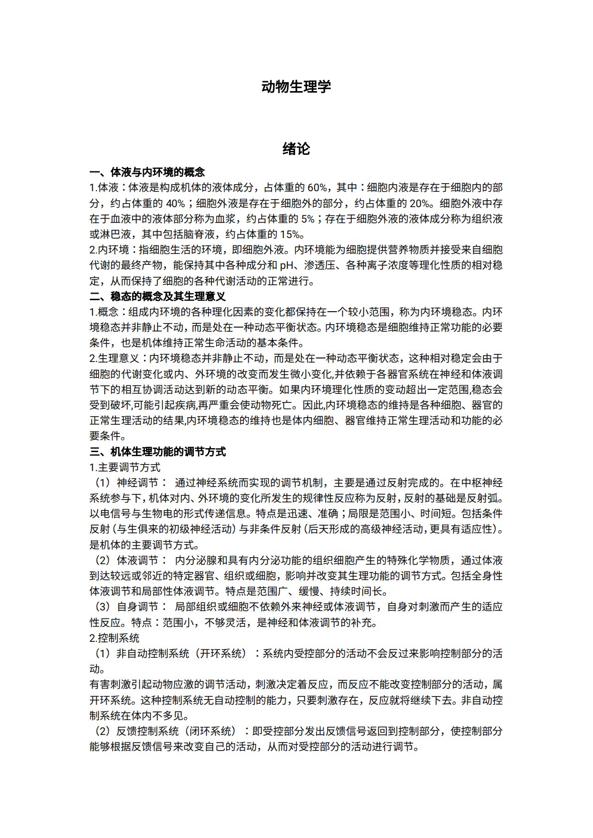 动物生理学绪论一、体液与内环境的概念1.体液:体液是构成机体的液体成分,占体重的60%,其中:细胞内液是存在于细胞内的部分,约占体重的40%;细胞外液是存在于细胞外的部分,约占体重的20%。细胞外液中存在于血液中的液体部分称为血浆,约占体重的5%;存在于细胞外液的液体成分称为组织液或淋巴液,其中包括脑脊液,约占体重的15%。2.内环境:指细胞生活的环境,即细胞外液。内环境能为细胞提供营养物质并接受来自细胞代谢的最终产物,能保持其中各种成分和pH、渗透压、各种离子浓度等理化性质的相对稳定,从而保持了细胞的各种代谢活动的正常进行。二、稳态的概念及其生理意义1.概念:组成内环境的各种理化因素的变化都...