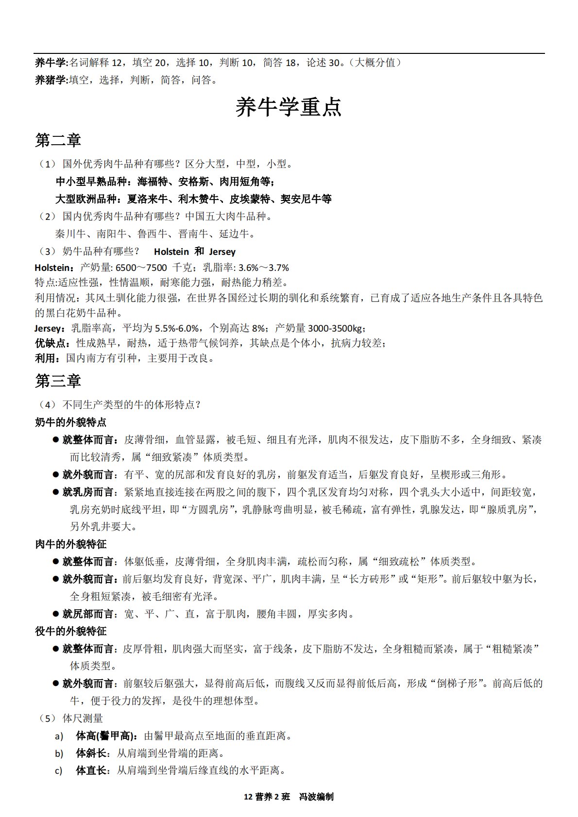 12营养2班冯波编制养牛学:名词解释12,填空20,选择10,判断10,简答18,论述30。(大概分值)养猪学:填空,选择,判断,简答,问答。养牛学重点第二章(1)国外优秀肉牛品种有哪些?区分大型,中型,小型。中小型早熟品种:海福特、安格斯、肉用短角等;大型欧洲品种:夏洛来牛、利木赞牛、皮埃蒙特、契安尼牛等(2)国内优秀肉牛品种有哪些?中国五大肉牛品种。秦川牛、南阳牛、鲁西牛、晋南牛、延边牛。(3)奶牛品种有哪些?Holstein和JerseyHolstein:产奶量:6500~7500千克;乳脂率:3.6%~3.7%特点:适应性强,性情温顺,耐寒能力强,耐热能力稍差。利用情况:其风土驯化能力...