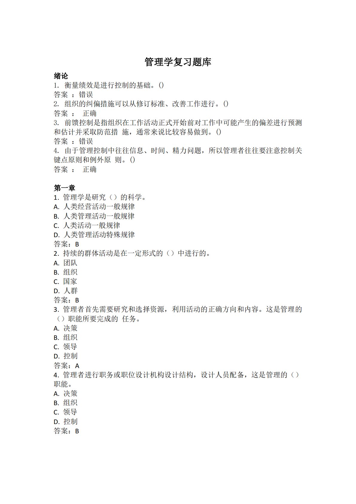 管理学复习题库绪论1.衡量绩效是进行控制的基础。()答案:错误2.组织的纠偏措施可以从修订标准、改善工作进行。()答案:正确3.前馈控制是指组织在工作活动正式开始前对工作中可能产生的偏差进行预测和估计并采取防范措施,通常来说比较容易做到。()答案:错误4.由于管理控制中往往信息、时间、精力问题,所以管理者往往要注意控制关键点原则和例外原则。()答案:正确第一章1.管理学是研究()的科学。A.人类经营活动一般规律B.人类管理活动一般规律C.人类活动一般规律D.人类管理活动特殊规律答案:B2.持续的群体活动是在一定形式的()中进行的。A.团队B.组织C.国家D.人群答案:B3.管理者首先需要研究和...